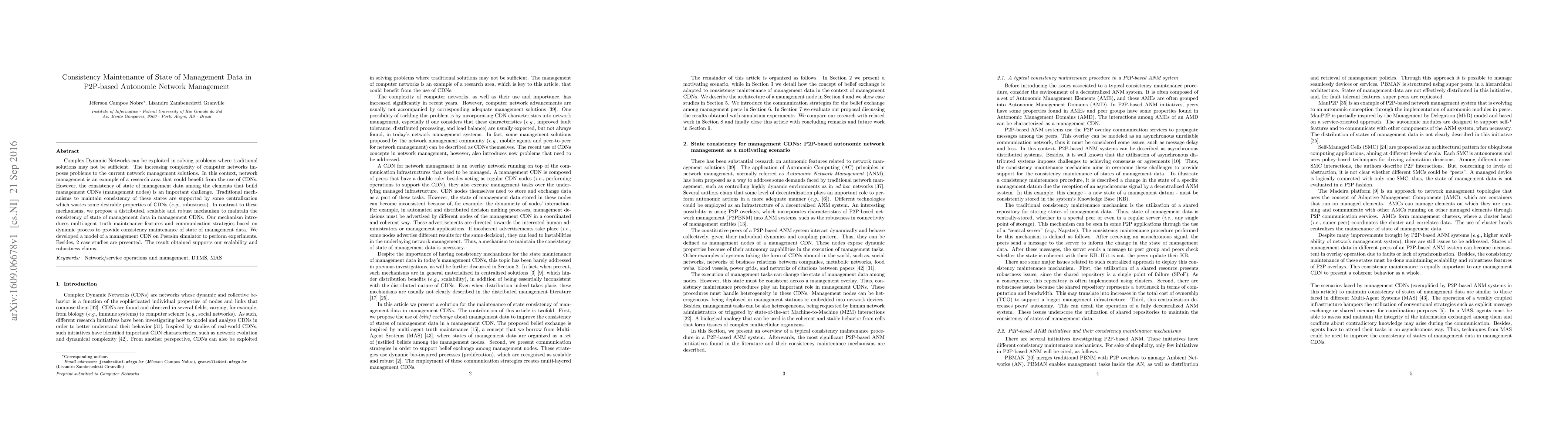 This paper proposes a distributed, scalable mechanism to maintain consistency of management data in Peer-to-Peer autonomic networks, leveraging multi-agent truth maintenance and dynamic process communication strategies. Experimental results on a Peersim simulator and two case studies demonstrate the scalability and robustness of the proposed approach.