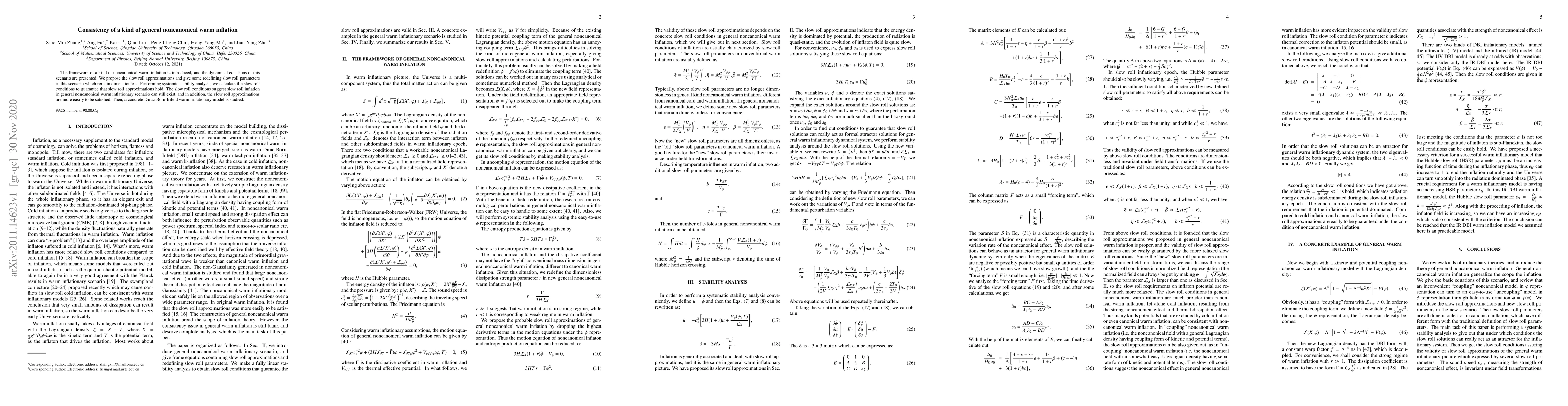 This paper introduces a noncanonical warm inflation model and presents its dynamical equations. It proposes slow roll approximations and redefines dimensionless slow roll parameters, showing that slow roll inflation can still exist under these conditions, and performs a stability analysis to support this claim.