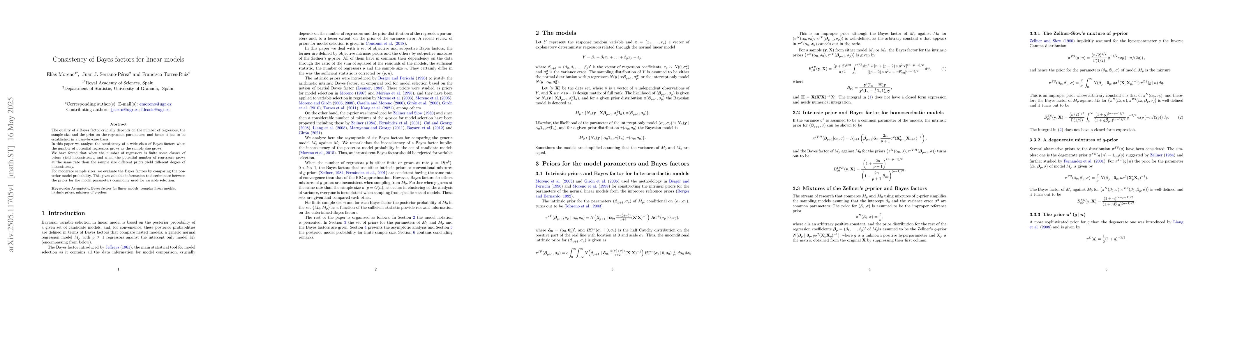 The paper analyzes the consistency of Bayes factors for linear models with a growing number of potential regressors relative to sample size, examining the impact of different priors on regression parameters.