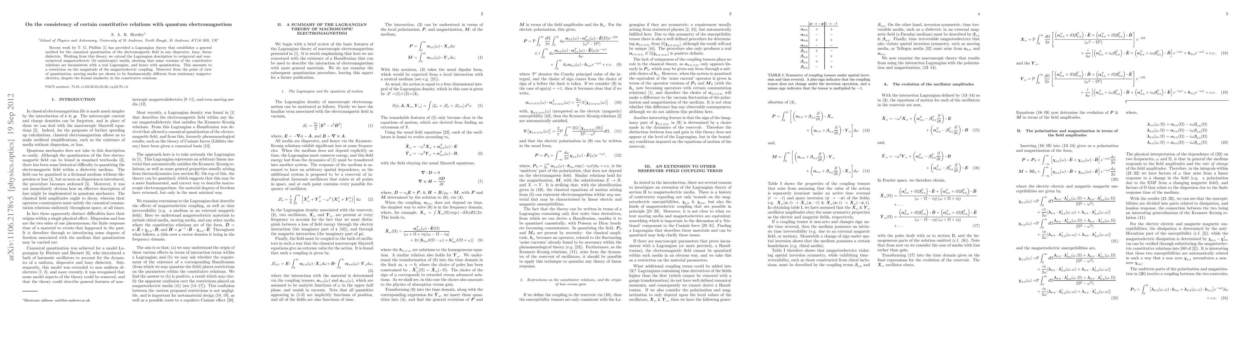 Recent work by Philbin [1] has provided a Lagrangian theory that establishes a general method for the canonical quantization of the electromagnetic field in any dispersive, lossy, linear dielectric. Working from this theory, we extend the Lagrangian description to reciprocal and non- reciprocal magnetoelectric (bi-anisotropic) media, showing that some versions of the constitutive relations are inconsistent with a real Lagrangian, and hence with quantization. This amounts to a restriction on the magnitude of the magnetoelectric coupling. Moreover from the point of view of quantization, moving media are shown to be fundamentally different from stationary magnetoelectrics, despite the formal similarity in the constitutive relations.