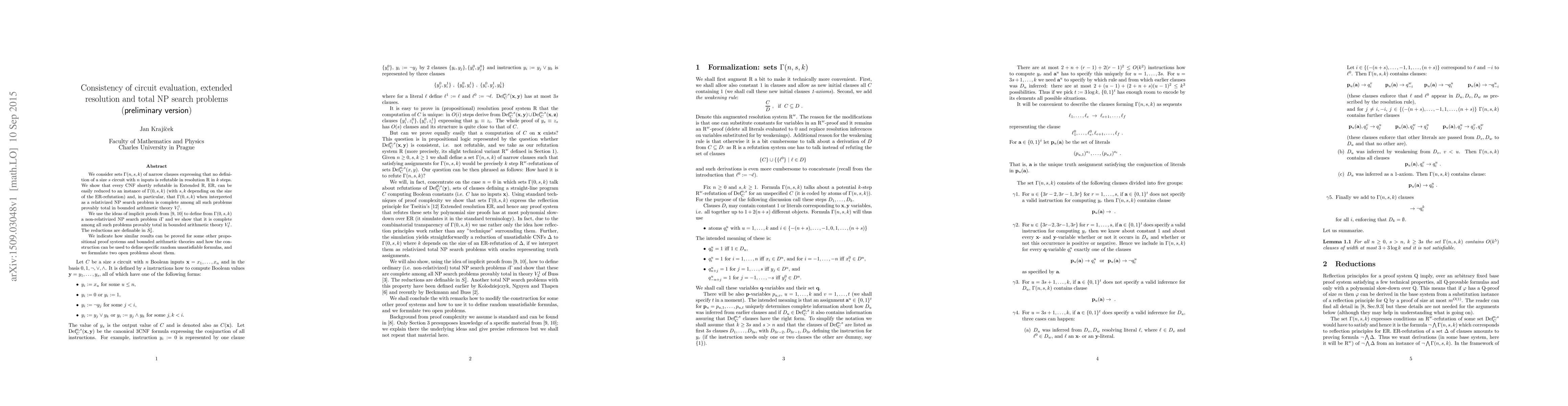 We consider sets $\Gamma(n,s,k)$ of narrow clauses expressing that no definition of a size $s$ circuit with $n$ inputs is refutable in resolution R in $k$ steps. We show that every CNF shortly refutable in Extended R, ER, can be easily reduced to an instance of $\Gamma(0,s,k)$ (with $s,k$ depending on the size of the ER-refutation) and, in particular, that $\Gamma(0,s,k)$ when interpreted as a relativized NP search problem is complete among all such problems provably total in bounded arithmetic theory $V^1_1$. We use the ideas of implicit proofs to define from $\Gamma(0,s,k)$ a non-relativized NP search problem $i\Gamma$ and we show that it is complete among all such problems provably total in bounded arithmetic theory $V^1_2$. The reductions are definable in $S^1_2$. We indicate how similar results can be proved for some other propositional proof systems and bounded arithmetic theories and how the construction can be used to define specific random unsatisfiable formulas, and we formulate two open problems about them.
