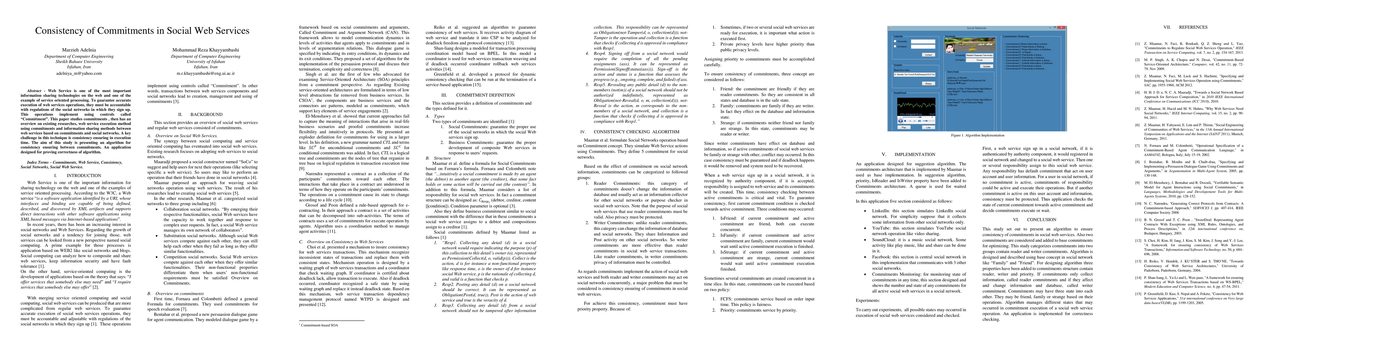 Web Service is one of the most important information sharing technologies on the web and one of the example of service oriented processing. To guarantee accurate execution of web services operations, they must be accountable with regulations of the social networks in which they sign up. This operations implement using controls called 'Commitment'. This paper studies commitments, then has an overview on existing researches, web service execution method using commitments and information sharing methods between web services based on commitments and social networks. A key challenge in this technique is consistency ensuring in execution time. The aim of this study is presenting an algorithm for consistency ensuring between commitments. An application designed for proving correctness of algorithm.