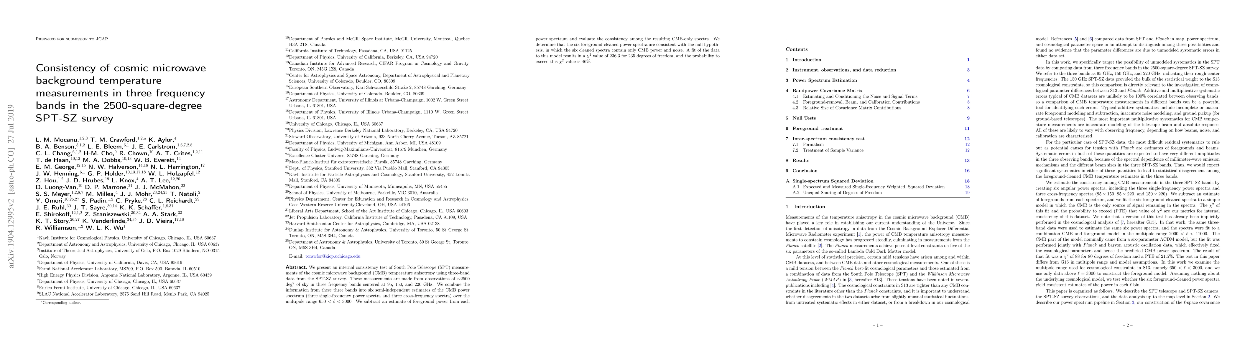 This study tests the consistency of South Pole Telescope (SPT) measurements of cosmic microwave background (CMB) temperature anisotropy across three frequency bands (95, 150, and 220 GHz) in a 2500-square-degree survey. The analysis finds that the six cleaned CMB power spectra from these bands are consistent with each other, supporting the null hypothesis of CMB power and noise only.
