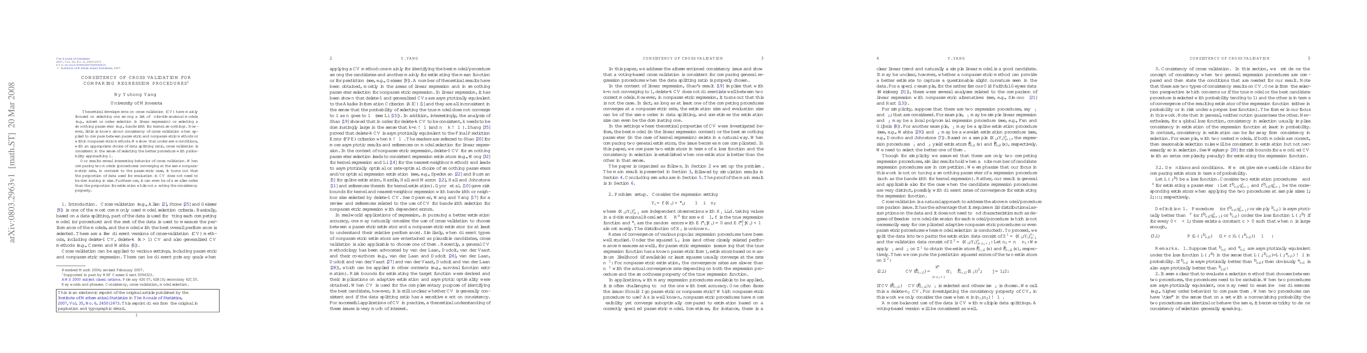 This paper explores the consistency of cross validation (CV) for comparing regression procedures, demonstrating that under certain conditions, CV can reliably select the better procedure as the sample size increases. It reveals that for comparing nonparametric methods, the proportion of data used for evaluation does not need to be significantly larger than that used for estimation, unlike in parametric cases.