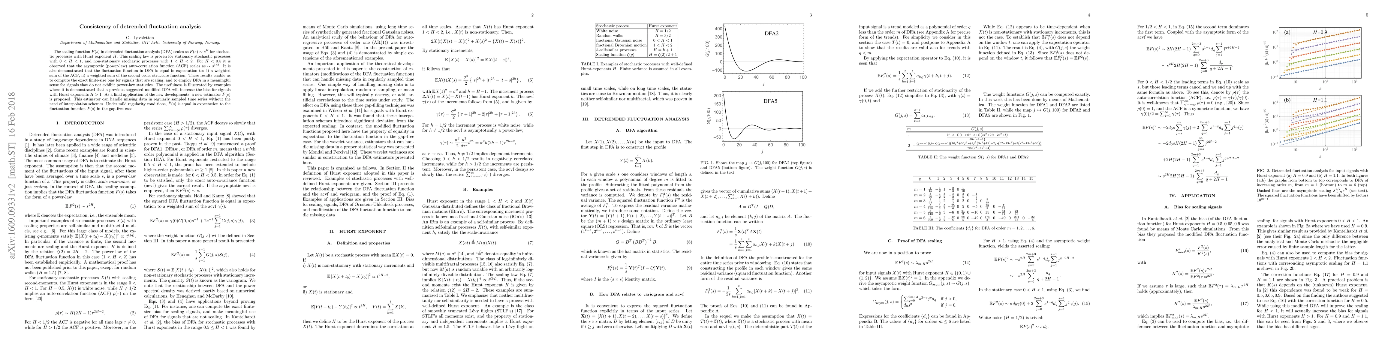 This paper proves the consistency of detrended fluctuation analysis (DFA) for both stationary and non-stationary stochastic processes, demonstrating the scaling law $F(s) \sim s^H$ for $0 < H < 2$. It also introduces an estimator $\hat F(s)$ for handling missing data without interpolation.