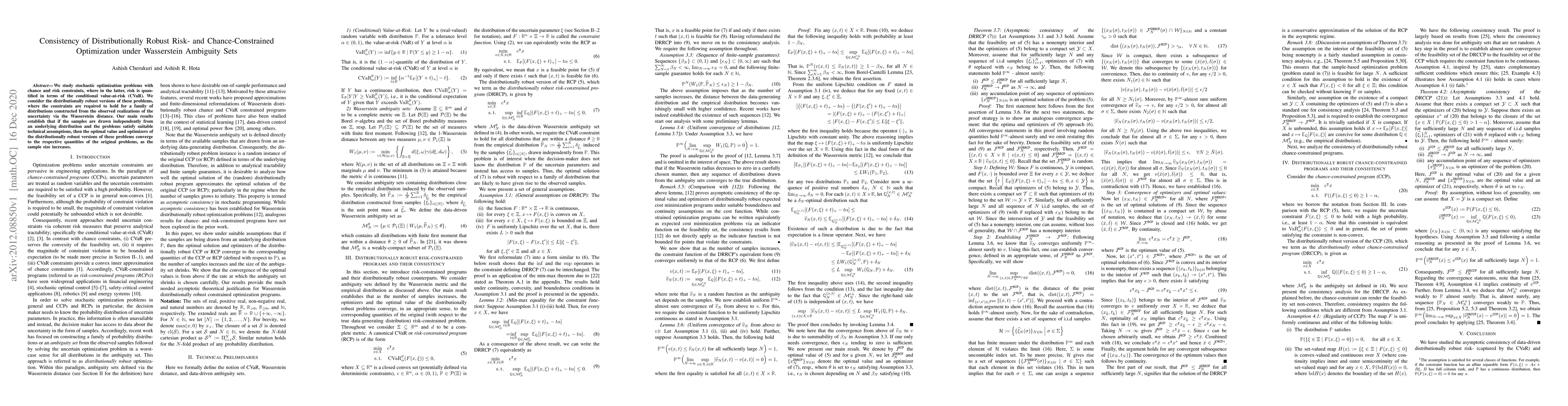 We study stochastic optimization problems with chance and risk constraints, where in the latter, risk is quantified in terms of the conditional value-at-risk (CVaR). We consider the distributionally robust versions of these problems, where the constraints are required to hold for a family of distributions constructed from the observed realizations of the uncertainty via the Wasserstein distance. Our main results establish that if the samples are drawn independently from an underlying distribution and the problems satisfy suitable technical assumptions, then the optimal value and optimizers of the distributionally robust versions of these problems converge to the respective quantities of the original problems, as the sample size increases.