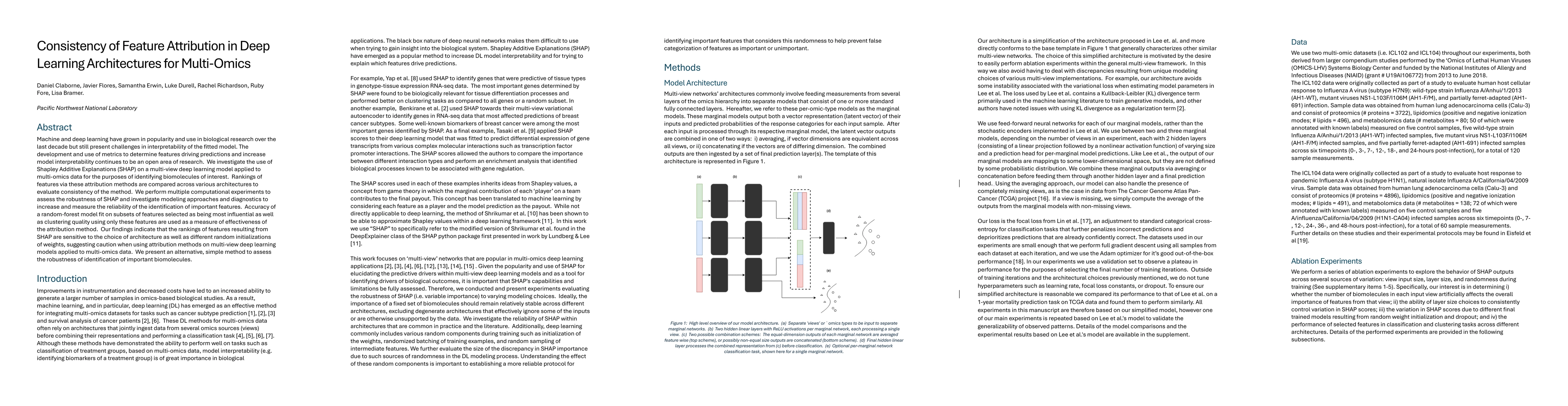 Machine and deep learning have grown in popularity and use in biological research over the last decade but still present challenges in interpretability of the fitted model. The development and use of metrics to determine features driving predictions and increase model interpretability continues to be an open area of research. We investigate the use of Shapley Additive Explanations (SHAP) on a multi-view deep learning model applied to multi-omics data for the purposes of identifying biomolecules of interest. Rankings of features via these attribution methods are compared across various architectures to evaluate consistency of the method. We perform multiple computational experiments to assess the robustness of SHAP and investigate modeling approaches and diagnostics to increase and measure the reliability of the identification of important features. Accuracy of a random-forest model fit on subsets of features selected as being most influential as well as clustering quality using only these features are used as a measure of effectiveness of the attribution method. Our findings indicate that the rankings of features resulting from SHAP are sensitive to the choice of architecture as well as different random initializations of weights, suggesting caution when using attribution methods on multi-view deep learning models applied to multi-omics data. We present an alternative, simple method to assess the robustness of identification of important biomolecules.