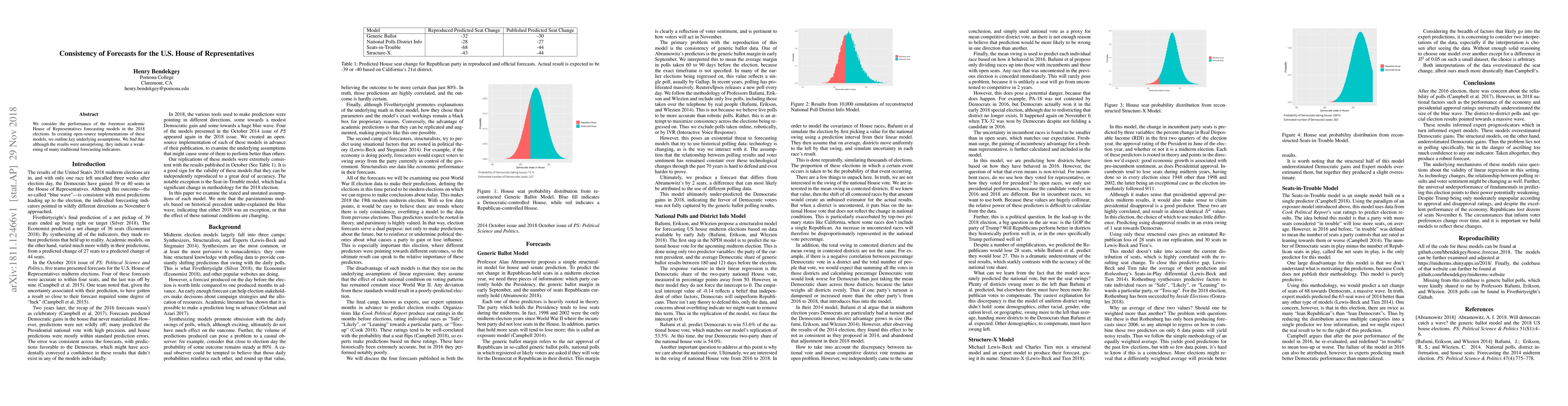 Summary: This study evaluates the performance of leading academic forecasting models for the 2018 U.S. House of Representatives elections, revealing a weakening of traditional forecasting indicators despite the models' consistent results. The research highlights the underlying assumptions of these models and their open-source implementations.