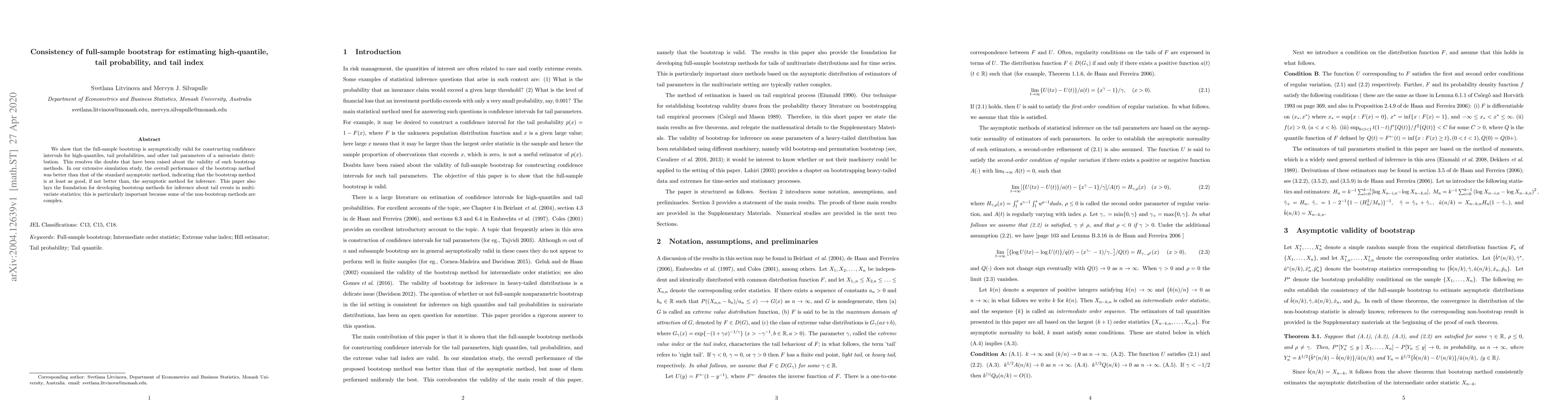 The full-sample bootstrap is shown to be asymptotically valid for estimating high-quantile probabilities and tail parameters, outperforming traditional methods in a simulation study.