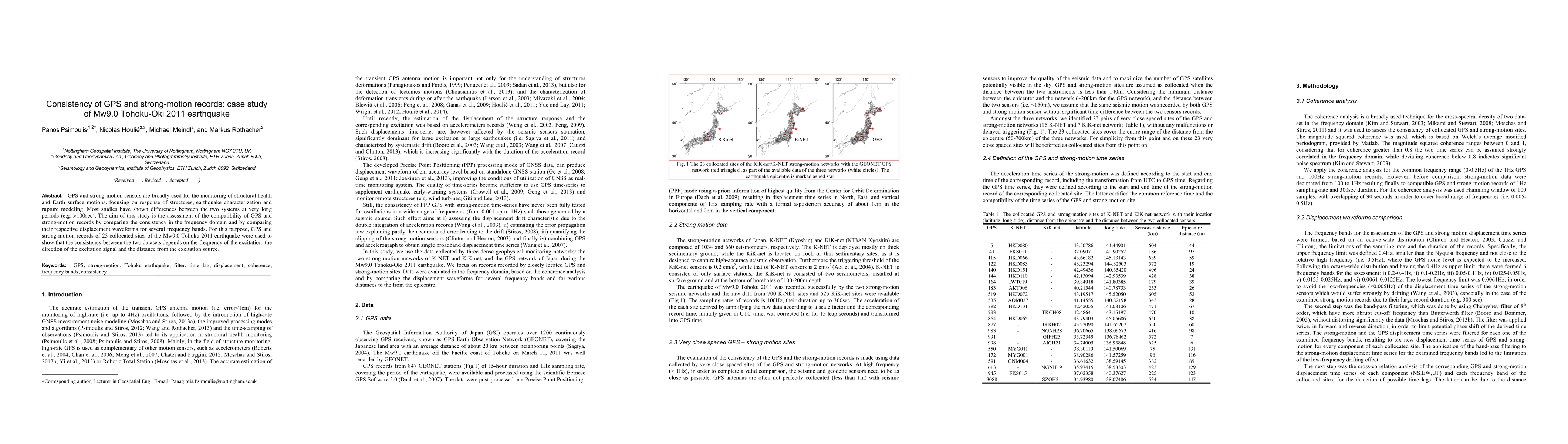 A study compared GPS and strong-motion records from 23 sites of the Mw9.0 Tohoku 2011 earthquake to assess their consistency, finding that it depends on frequency, excitation direction, and distance from the source.