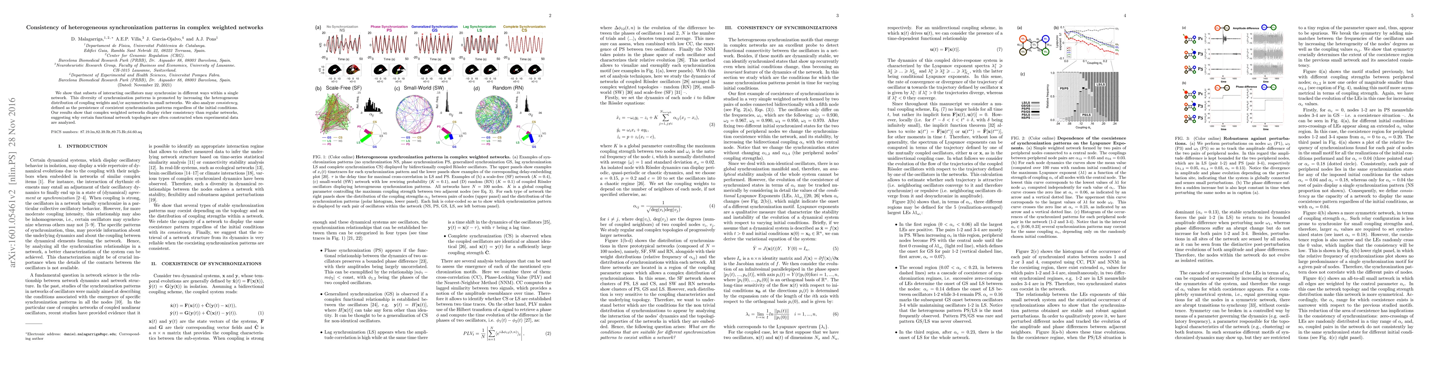 We show that subsets of interacting oscillators may synchronize in different ways within a single network. This diversity of synchronization patterns is promoted by increasing the heterogeneous distribution of coupling weights and/or asymmetries in small networks. We also analyze consistency, defined as the persistence of coexistent synchronization patterns regardless of the initial conditions. Our results show that complex weighted networks display richer consistency than regular networks, suggesting why certain functional network topologies are often constructed when experimental data are analyzed.