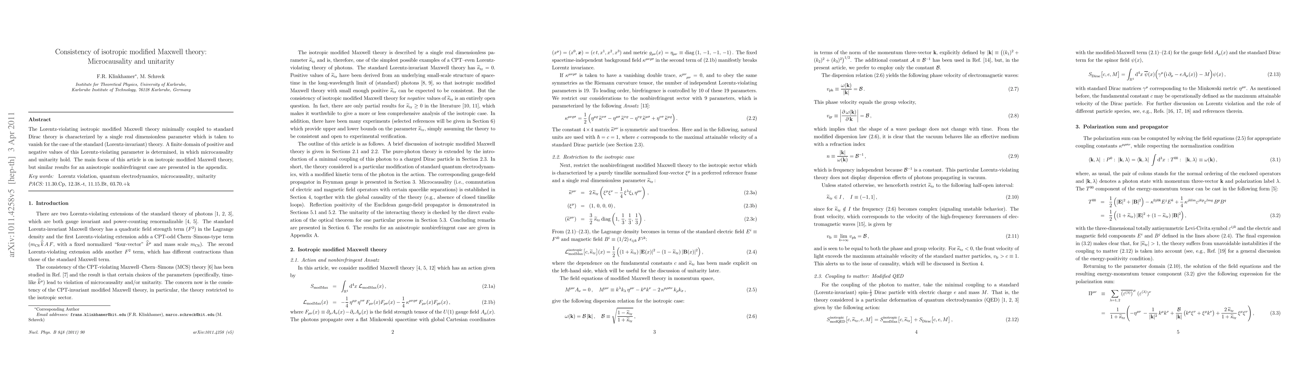This paper investigates the consistency of isotropic modified Maxwell theory, demonstrating that microcausality and unitarity are maintained within a finite range of Lorentz-violating parameters. The study also briefly examines analogous results for two anisotropic nonbirefringent cases.