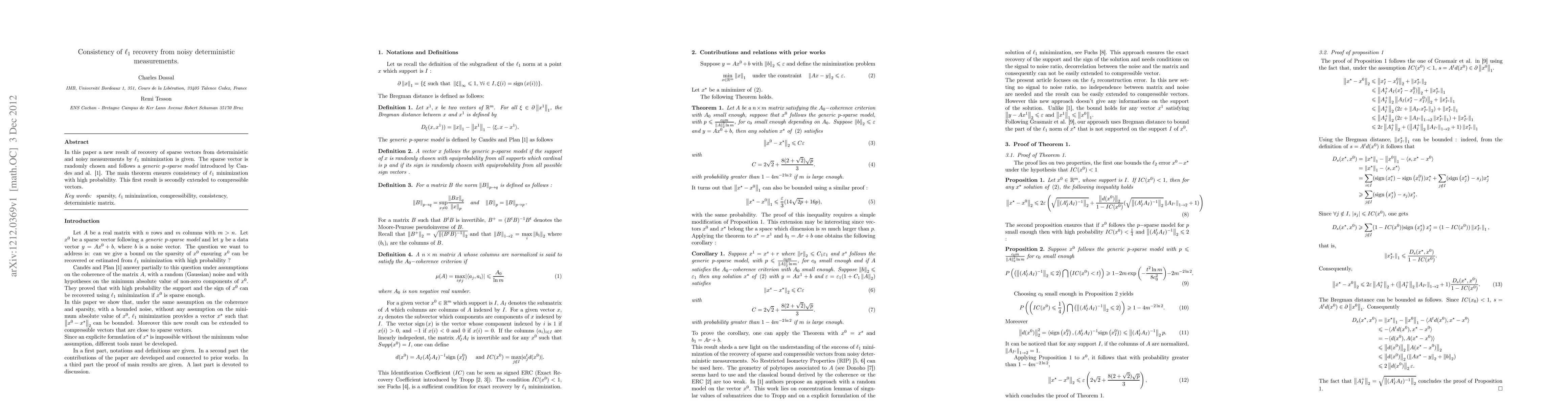 The paper introduces a new method for sparse vector recovery from noisy deterministic measurements using l1 minimization, ensuring consistency with high probability and extending the result to compressible vectors.