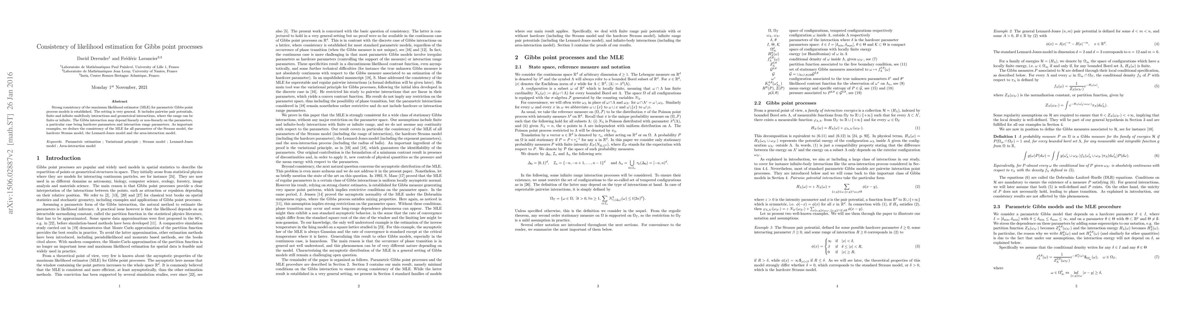 This paper establishes the strong consistency of the maximum likelihood estimator for a wide range of parametric Gibbs point process models, including various interaction types and potential dependencies. It specifically confirms the consistency for parameters in the Strauss, hardcore Strauss, Lennard-Jones, and area-interaction models.