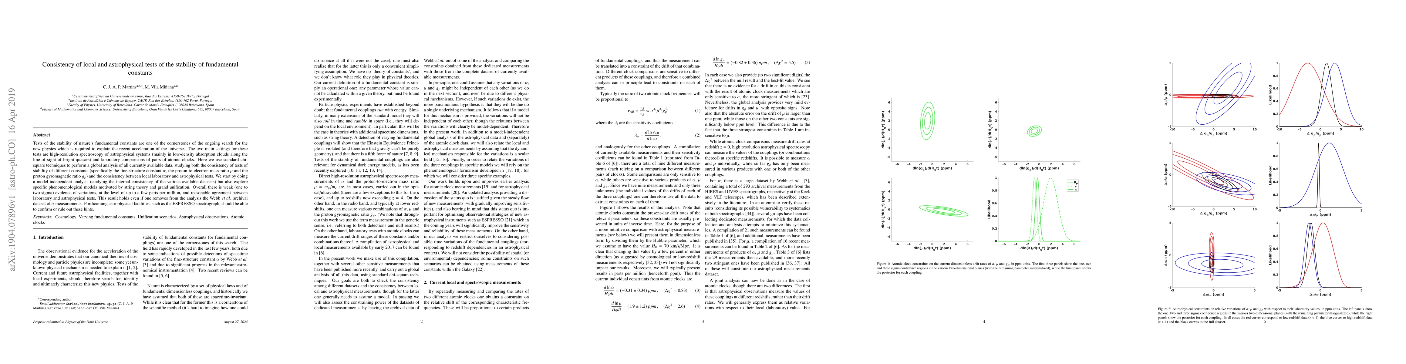 This paper conducts a global analysis of data from both astrophysical and laboratory tests to assess the stability of fundamental constants, finding weak evidence of variations at the level of a few parts per million with reasonable agreement between the two test types. Upcoming astrophysical instruments may confirm or refute these hints.
