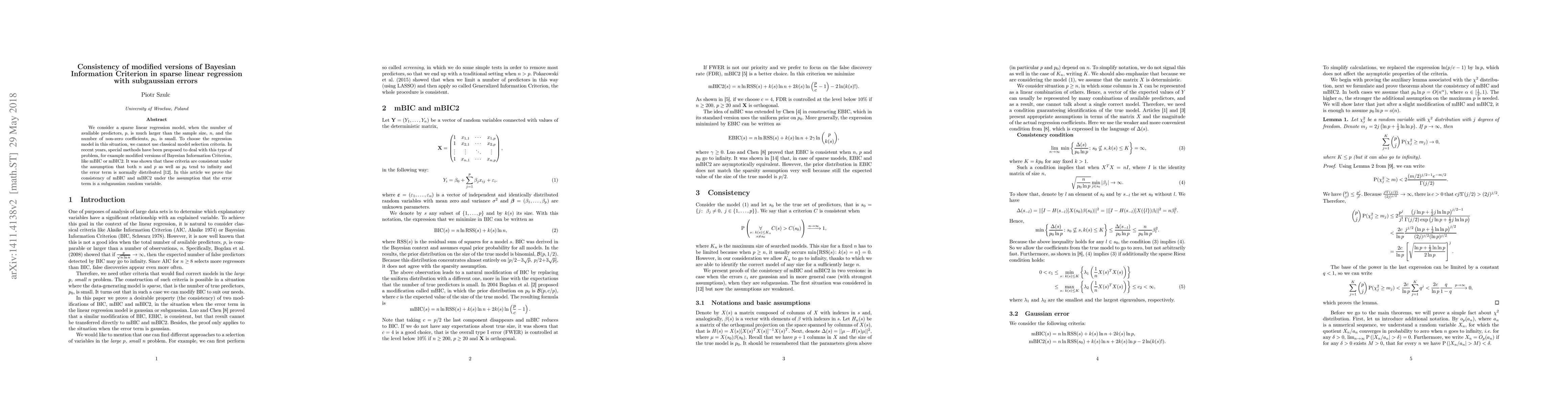 We consider a sparse linear regression model, when the number of available predictors, $p$, is much larger than the sample size, $n$, and the number of non-zero coefficients, $p_0$, is small. To choose the regression model in this situation, we cannot use classical model selection criteria. In recent years, special methods have been proposed to deal with this type of problem, for example modified versions of Bayesian Information Criterion, like mBIC or mBIC2. It was shown that these criteria are consistent under the assumption that both $n$ and $p$ as well as $p_0$ tend to infinity and the error term is normally distributed. In this article we prove the consistency of mBIC and mBIC2 under the assumption that the error term is a subgaussian random variable.