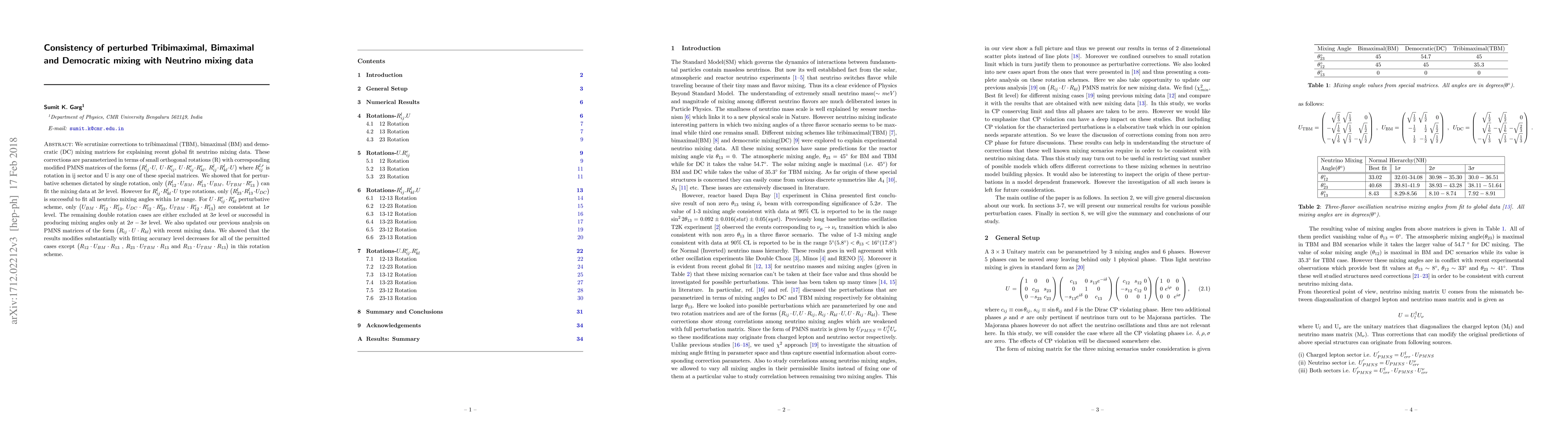 We scrutinize corrections to tribimaximal (TBM), bimaximal (BM) and democratic (DC) mixing matrices for explaining recent global fit neutrino mixing data. These corrections are parameterized in terms of small orthogonal rotations (R) with corresponding modified PMNS matrices of the forms \big($R_{ij}^l\cdot U,~U\cdot R_{ij}^r,~U \cdot R_{ij}^r \cdot R_{kl}^r,~R_{ij}^l \cdot R_{kl}^l \cdot U$\big ) where $R_{ij}^{l, r}$ is rotation in ij sector and U is any one of these special matrices. We showed that for perturbative schemes dictated by single rotation, only \big($ R_{12}^l\cdot U_{BM},~R_{13}^l\cdot U_{BM},~U_{TBM}\cdot R_{13}^r$ \big ) can fit the mixing data at $3\sigma$ level. However for $R_{ij}^l\cdot R_{kl}^l\cdot U$ type rotations, only \big ($R_{23}^l\cdot R_{13}^l \cdot U_{DC} $\big ) is successful to fit all neutrino mixing angles within $1\sigma$ range. For $U\cdot R_{ij}^r\cdot R_{kl}^r$ perturbative scheme, only \big($U_{BM} \cdot R_{12}^r\cdot R_{13}^r$,~$U_{DC} \cdot R_{12}^r\cdot R_{23}^r$,~$U_{TBM} \cdot R_{12}^r\cdot R_{13}^r$\big ) are consistent at $1\sigma$ level. The remaining double rotation cases are either excluded at 3$\sigma$ level or successful in producing mixing angles only at $2\sigma-3\sigma$ level. We also updated our previous analysis on PMNS matrices of the form \big($R_{ij}\cdot U \cdot R_{kl}$\big ) with recent mixing data. We showed that the results modifies substantially with fitting accuracy level decreases for all of the permitted cases except \big($R_{12}\cdot U_{BM}\cdot R_{13}$, $R_{23}\cdot U_{TBM}\cdot R_{13}$ and $R_{13}\cdot U_{TBM} \cdot R_{13}$\big ) in this rotation scheme.