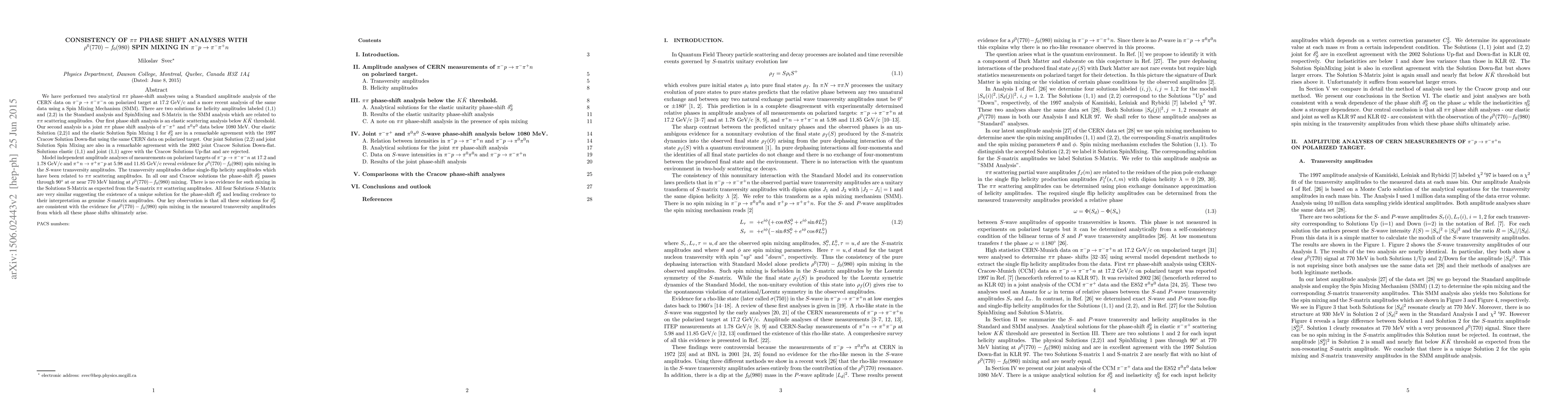 We have performed two analytical pipi phase shift analyses using a Standard amplitude analysis of the CERN data on pi(-)p->pi(-)pi(+)n on polarized target at 17.2 GeV/c and a more recent analysis of the same data using Spin Mixing Mechanism (SMM). There are two solutions for helicity amplitudes labeled (1,1) and (2,2) in the Standard analysis and SpinMixing and S-Matrix in the SMM analysis which are related to the pipi scattering amplitudes. Our first phase shift analysis is an elastic scattering analysis below KKbar threshold. Our second analysis is a joint pipi phase shift analysis of pi(-)pi(+) and pi(0)pi(0) data below 1080 MeV. Our elastic Solution (2,2)1 and elastic Solution SpinMixing 1 for delta^0_S are in a remarkable agreement with the 1997 Cracow Solution Down-flat using the same CERN data on polarized target. Our joint Solution (2,2) and joint Solution SpinMixing are also in a remarkable agreement with the 2002 joint Cracow Solution Down-flat. Solutions elastic (1,1) and joint (1,1) agree with the Cracow Solutions Up-flat and are rejected. Model independent amplitude analyses of measurements of pi(-)p->pi(-)pi(+)n at 17.2 and 1.78 GeV/c and pi(+)n->pi(+)pi(-)p at 5.98 and 11.85 GeV/c reveal evidence for rho^0(770)-f_0(980) spin mixing in the S-wave transversity amplitudes. These transversity amplitudes define single-flip helicity amplitudes which have been related to pipi scattering amplitudes. Our key observation is that the presented and the Cracow solutions are consistent with the evidence for rho^0(770)-f_0(980) spin mixing in the measured transversity amplitudes from which all these phase shifts ultimately arise.