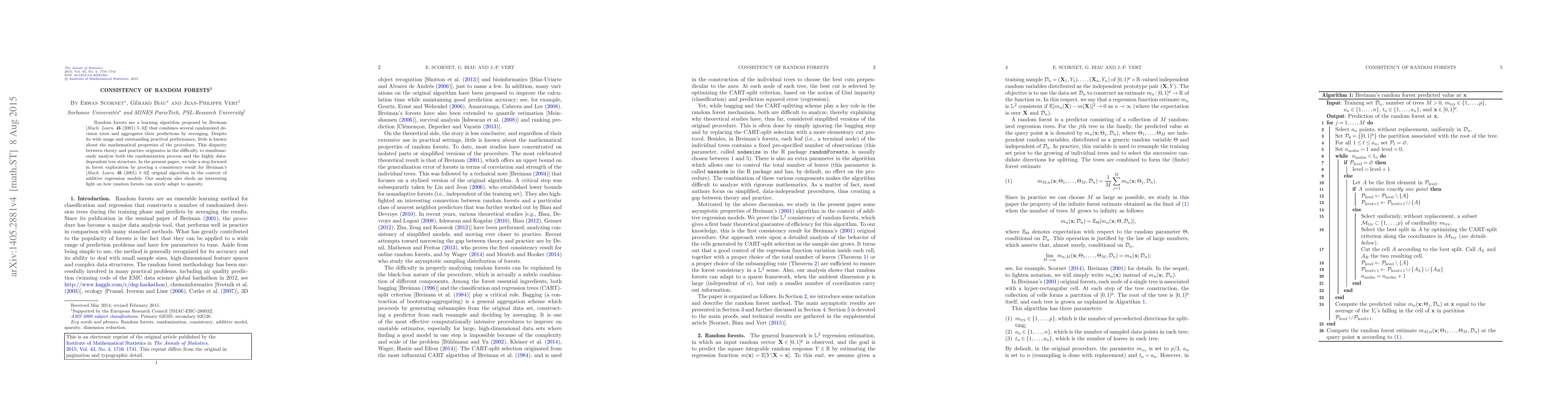 Random forests are a learning algorithm proposed by Breiman [Mach. Learn. 45 (2001) 5--32] that combines several randomized decision trees and aggregates their predictions by averaging. Despite its wide usage and outstanding practical performance, little is known about the mathematical properties of the procedure. This disparity between theory and practice originates in the difficulty to simultaneously analyze both the randomization process and the highly data-dependent tree structure. In the present paper, we take a step forward in forest exploration by proving a consistency result for Breiman's [Mach. Learn. 45 (2001) 5--32] original algorithm in the context of additive regression models. Our analysis also sheds an interesting light on how random forests can nicely adapt to sparsity. 1. Introduction. Random forests are an ensemble learning method for classification and regression that constructs a number of randomized decision trees during the training phase and predicts by averaging the results. Since its publication in the seminal paper of Breiman (2001), the procedure has become a major data analysis tool, that performs well in practice in comparison with many standard methods. What has greatly contributed to the popularity of forests is the fact that they can be applied to a wide range of prediction problems and have few parameters to tune. Aside from being simple to use, the method is generally recognized for its accuracy and its ability to deal with small sample sizes, high-dimensional feature spaces and complex data structures. The random forest methodology has been successfully involved in many practical problems, including air quality prediction (winning code of the EMC data science global hackathon in 2012, see http://www.kaggle.com/c/dsg-hackathon), chemoinformatics [Svetnik et al. (2003)], ecology [Prasad, Iverson and Liaw (2006), Cutler et al. (2007)], 3D