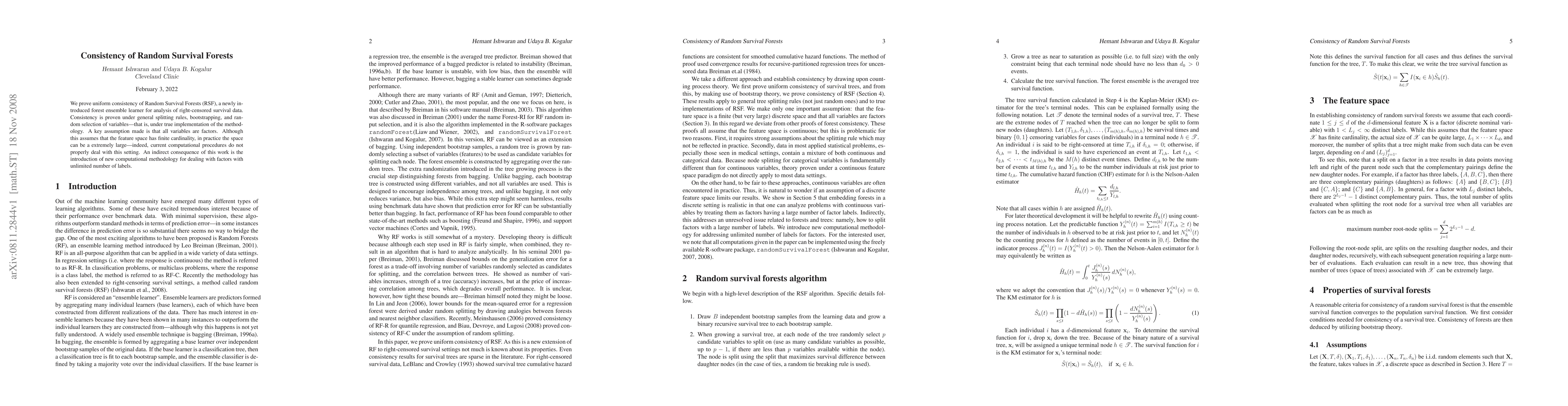 This paper proves the uniform consistency of Random Survival Forests (RSF) under general conditions, including bootstrapping and variable selection, assuming all variables are categorical factors. It also introduces new computational methods for handling factors with an infinite number of labels.