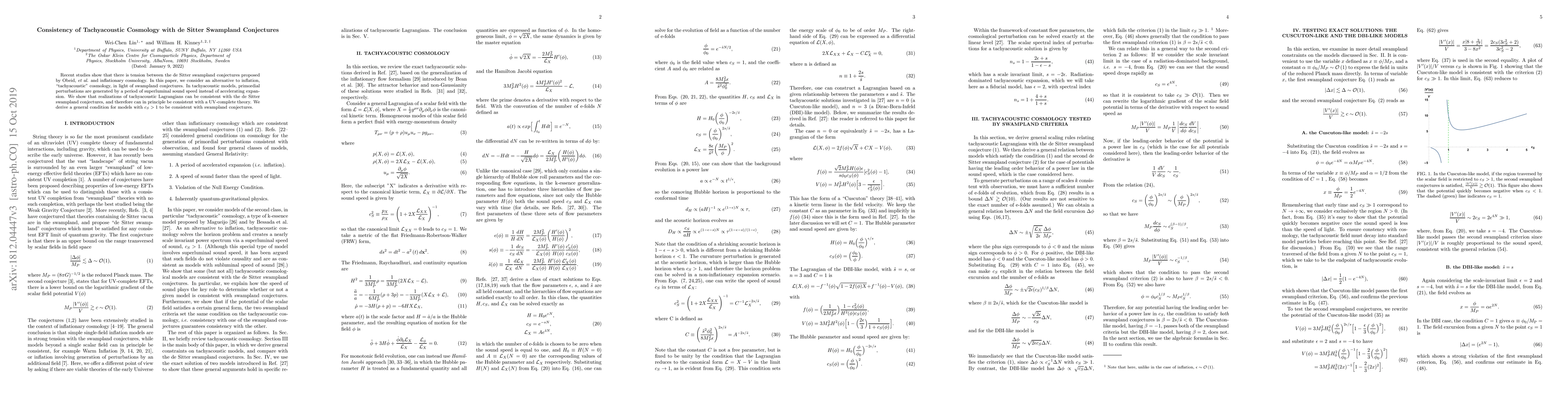 Recent studies show that there is tension between the de Sitter swampland conjectures proposed by Obeid, et al. and inflationary cosmology. In this paper, we consider an alternative to inflation, `tachyacoustic' cosmology, in light of swampland conjectures. In tachyacoustic models, primordial perturbations are generated by a period of superluminal sound speed instead of accelerating expansion. We show that realizations of tachyacoustic Lagrangians can be consistent with the de Sitter swampland conjectures, and therefore can in principle be consistent with a UV-complete theory. We derive a general condition for models with $c_S > 1$ to be consistent with swampland conjectures.