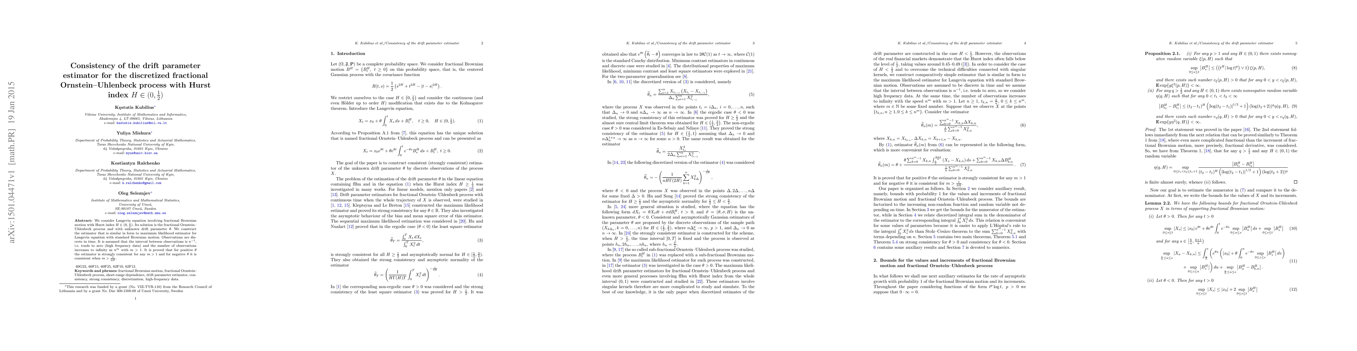 We consider Langevin equation involving fractional Brownian motion with Hurst index $H\in(0,\frac12)$. Its solution is the fractional Ornstein-Uhlenbeck process and with unknown drift parameter $\theta$. We construct the estimator that is similar in form to maximum likelihood estimator for Langevin equation with standard Brownian motion. Observations are discrete in time. It is assumed that the interval between observations is $n^{-1}$, i.e. tends to zero (high frequency data) and the number of observations increases to infinity as $n^m$ with $m>1$. It is proved that for positive $\theta$ the estimator is strongly consistent for any $m>1$ and for negative $\theta$ it is consistent when $m>\frac{1}{2H}$.