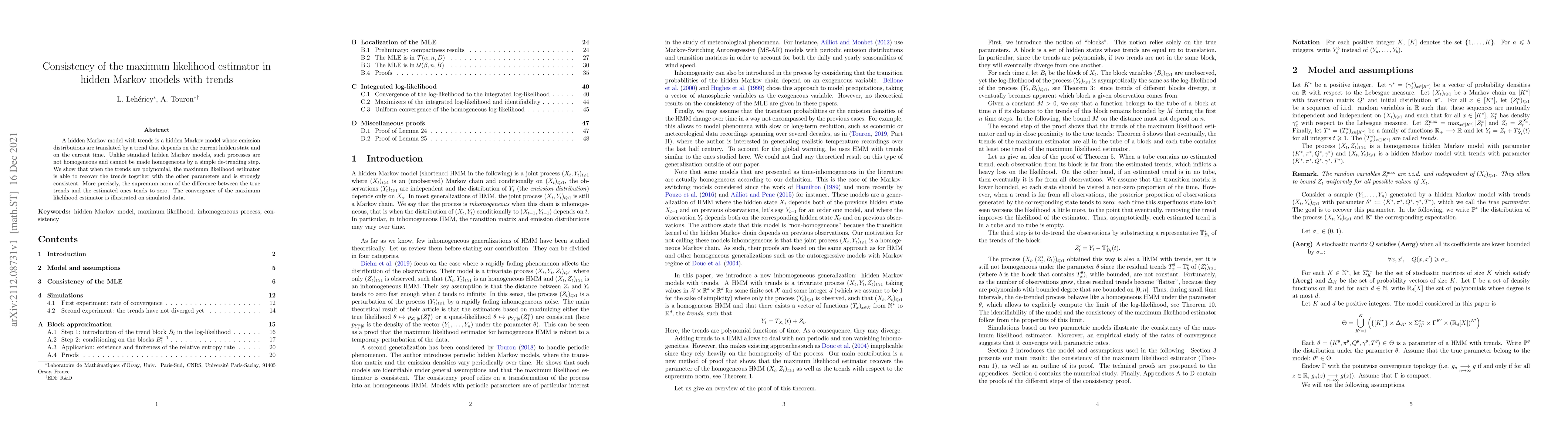 A hidden Markov model with trends is a hidden Markov model whose emission distributions are translated by a trend that depends on the current hidden state and on the current time. Contrary to standard hidden Markov models, such processes are not homogeneous and cannot be made homogeneous by a simple de-trending step. We show that when the trends are polynomial, the maximum likelihood estimator is able to recover the trends together with the other parameters and is strongly consistent. More precisely, the supremum norm of the difference between the true trends and the estimated ones tends to zero. Numerical properties of the maximum likelihood estimator are assessed by a simulation study.