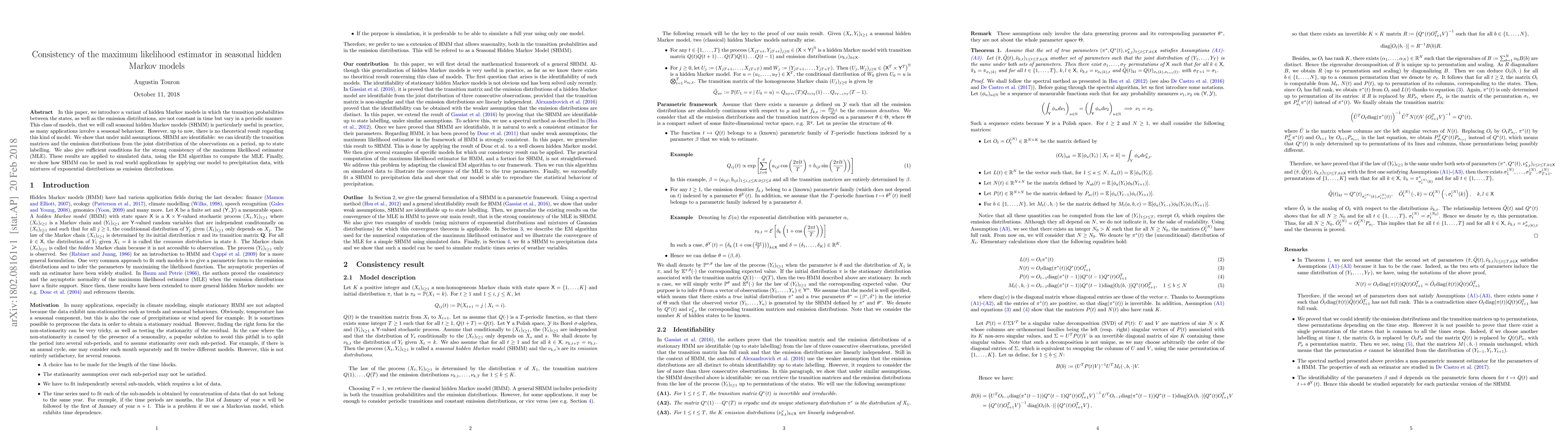 This paper introduces seasonal hidden Markov models (SHMM) where transition probabilities and emission distributions vary periodically. It establishes identifiability and strong consistency of the maximum likelihood estimator under mild assumptions, demonstrating its applicability through simulations and real-world precipitation data analysis.