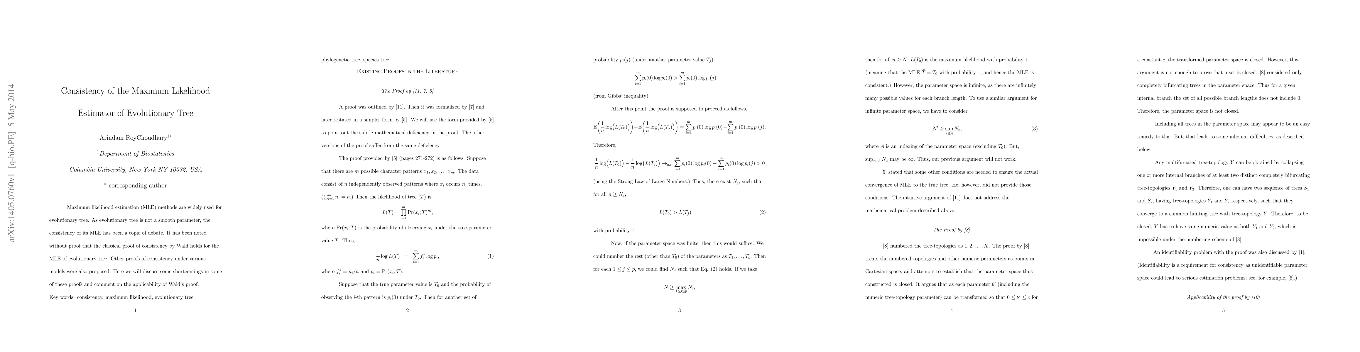 This paper examines the consistency of the maximum likelihood estimator (MLE) for evolutionary trees, addressing the debate over its validity due to the non-smooth nature of evolutionary trees. It critiques existing proofs and discusses the applicability of Wald's classical proof of consistency.