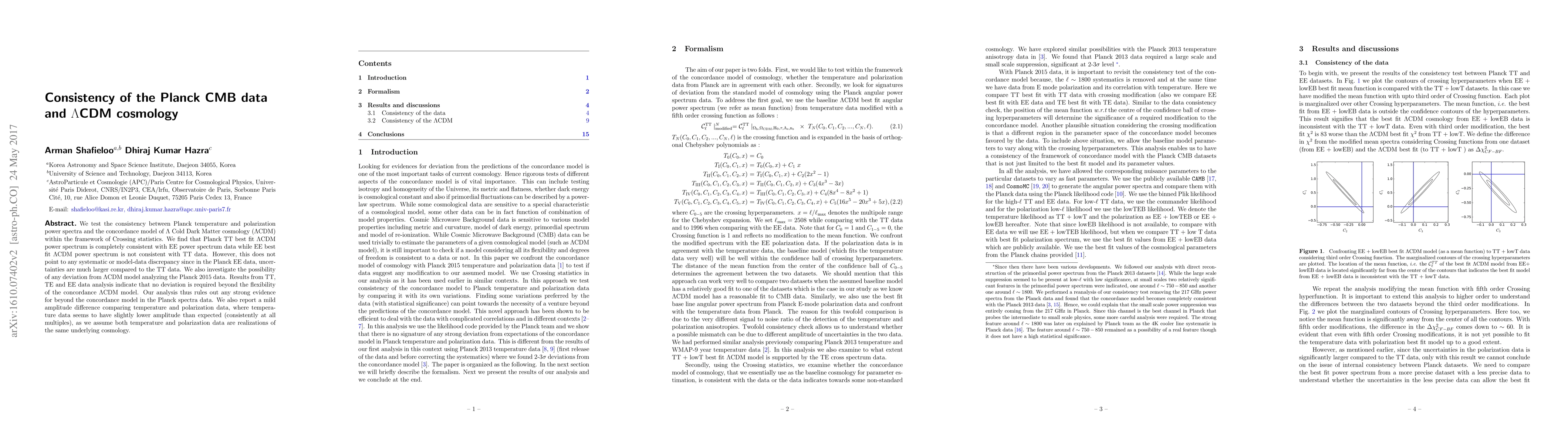 We test the consistency between Planck temperature and polarization power spectra and the concordance model of $\Lambda$ Cold Dark Matter cosmology ($\Lambda$CDM) within the framework of Crossing statistics. We find that Planck TT best fit $\Lambda$CDM power spectrum is completely consistent with EE power spectrum data while EE best fit $\Lambda$CDM power spectrum is not consistent with TT data. However, this does not point to any systematic or model-data discrepancy since in the Planck EE data, uncertainties are much larger compared to the TT data. We also investigate the possibility of any deviation from $\Lambda$CDM model analyzing the Planck 2015 data. Results from TT, TE and EE data analysis indicate that no deviation is required beyond the flexibility of the concordance $\Lambda$CDM model. Our analysis thus rules out any strong evidence for beyond the concordance model in the Planck spectra data. We also report a mild amplitude difference comparing temperature and polarization data, where temperature data seems to have slightly lower amplitude than expected (consistently at all multiples), as we assume both temperature and polarization data are realizations of the same underlying cosmology.