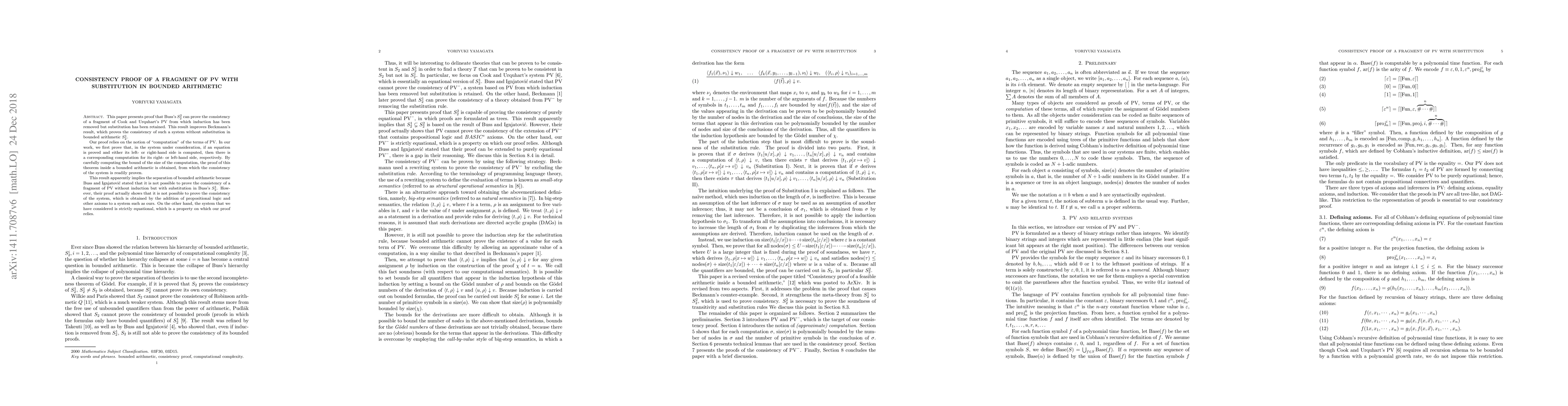 This paper presents proof that Buss's $S^2_2$ can prove the consistency of a fragment of Cook and Urquhart's $\mathrm{PV}$ from which induction has been removed but substitution has been retained. This result improves Beckmann's result, which proves the consistency of such a system without substitution in bounded arithmetic $S^1_2$. Our proof relies on the notion of "computation" of the terms of $\mathrm{PV}$. In our work, we first prove that, in the system under consideration, if an equation is proved and either its left- or right-hand side is computed, then there is a corresponding computation for its right- or left-hand side, respectively. By carefully computing the bound of the size of the computation, the proof of this theorem inside a bounded arithmetic is obtained, from which the consistency of the system is readily proven. This result apparently implies the separation of bounded arithmetic because Buss and Ignjatovi\'c stated that it is not possible to prove the consistency of a fragment of $\mathrm{PV}$ without induction but with substitution in Buss's $S^1_2$. However, their proof actually shows that it is not possible to prove the consistency of the system, which is obtained by the addition of propositional logic and other axioms to a system such as ours. On the other hand, the system that we have considered is strictly equational, which is a property on which our proof relies.