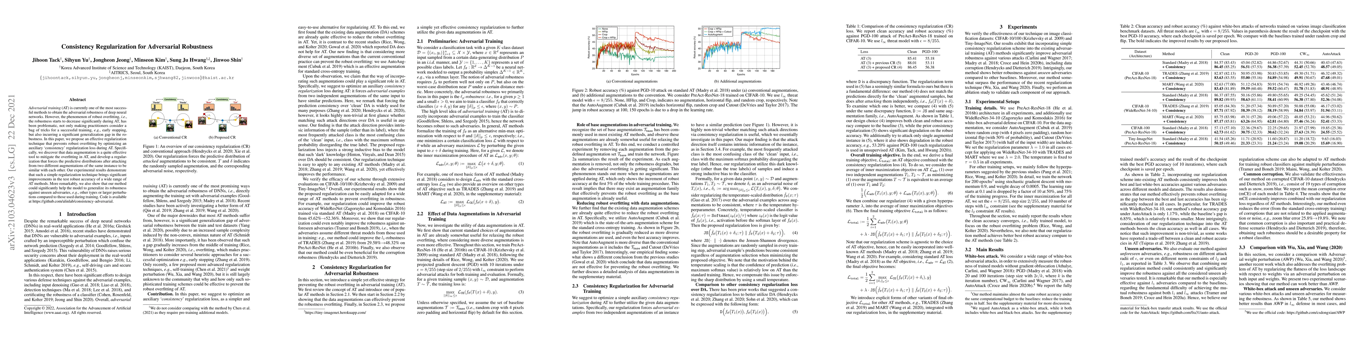 This paper proposes a consistency regularization technique to mitigate robust overfitting in adversarial training, optimizing an auxiliary loss that enforces similarity in predictive distributions from different data augmentations of the same instance. The method significantly improves test robust accuracy and enhances generalization to unseen adversaries.