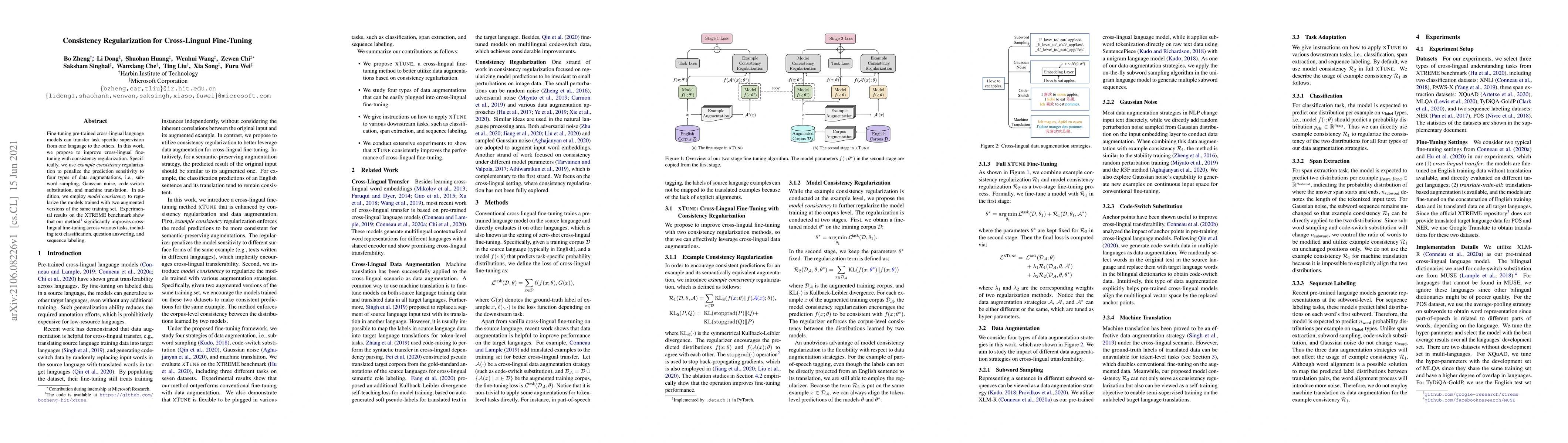 This paper proposes a consistency regularization method to enhance cross-lingual fine-tuning of pre-trained language models, using data augmentations to improve task-specific transfer across languages. Experimental results demonstrate significant improvements across various NLP tasks on the XTREME benchmark.