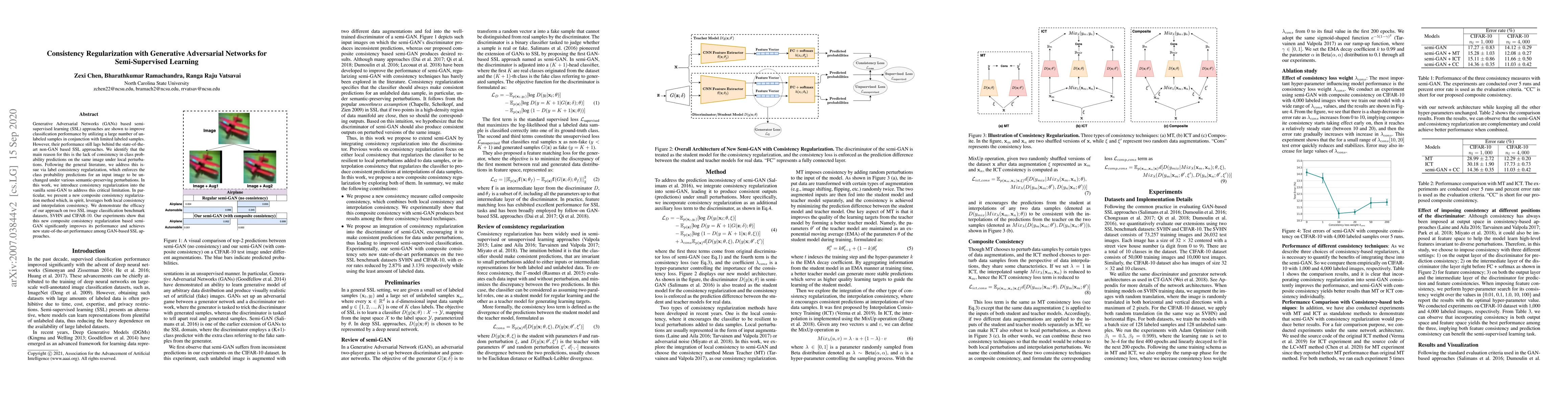 This paper introduces consistency regularization into semi-supervised GANs to enhance classification performance by enforcing label consistency under image perturbations. The proposed composite method improves state-of-the-art performance on SVHN and CIFAR-10 datasets.