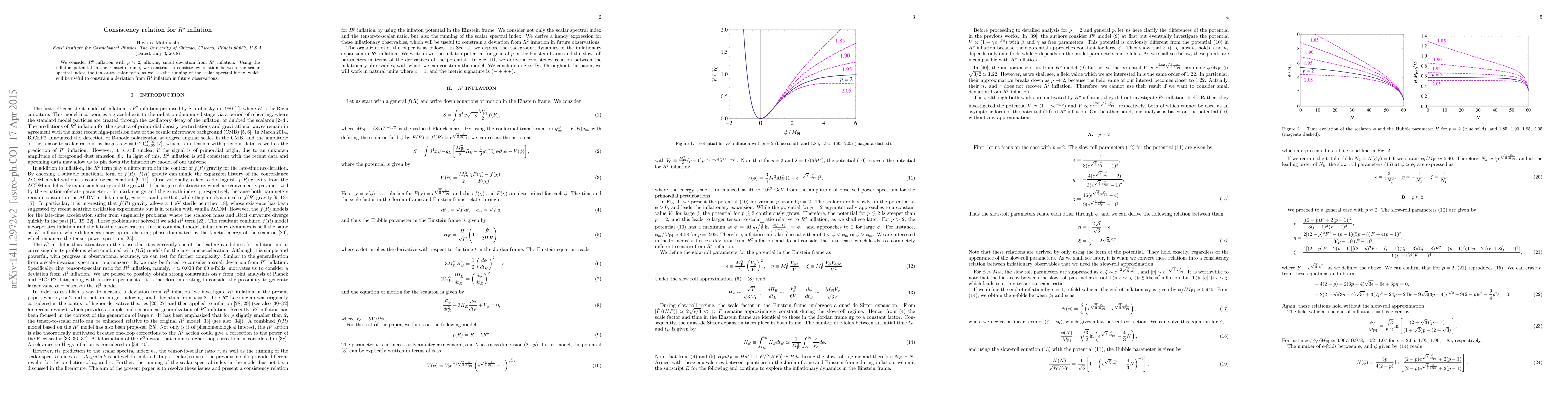 This paper constructs a consistency relation for $R^p$ inflation with $p \approx 2$, allowing for slight deviations from $R^2$ inflation. It uses the inflaton potential in the Einstein frame to link the scalar spectral index, tensor-to-scalar ratio, and running of the scalar spectral index, aiming to constrain such deviations in future observational data.