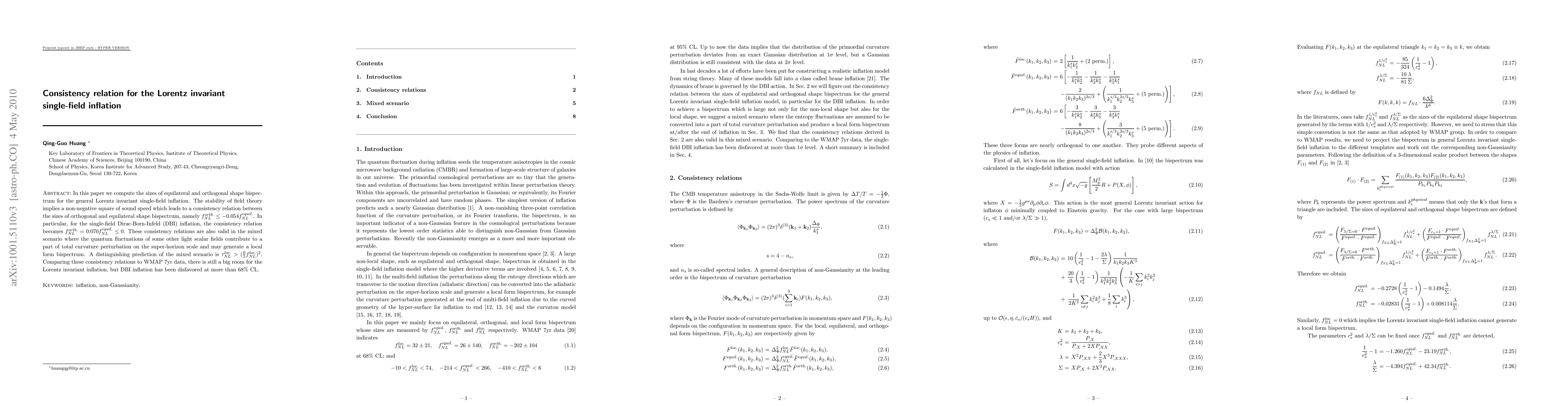 In this paper we compute the sizes of equilateral and orthogonal shape bispectrum for the general Lorentz invariant single-field inflation. The stability of field theory implies a non-negative square of sound speed which leads to a consistency relation between the sizes of orthogonal and equilateral shape bispectrum, namely $f_{NL}^{orth.}\lesssim -0.054 f_{NL}^{equil.}$. In particular, for the single-field Dirac-Born-Infeld (DBI) inflation, the consistency relation becomes $f_{NL}^{orth.}\simeq 0.070 f_{NL}^{equil.}\lesssim 0$. These consistency relations are also valid in the mixed scenario where the quantum fluctuations of some other light scalar fields contribute to a part of total curvature perturbation on the super-horizon scale and may generate a local form bispectrum. A distinguishing prediction of the mixed scenario is $\tau_{NL}^{loc.}>({6\over 5}f_{NL}^{loc.})^2$. Comparing these consistency relations to WMAP 7yr data, there is still a big room for the Lorentz invariant inflation, but DBI inflation has been disfavored at more than 68% CL.