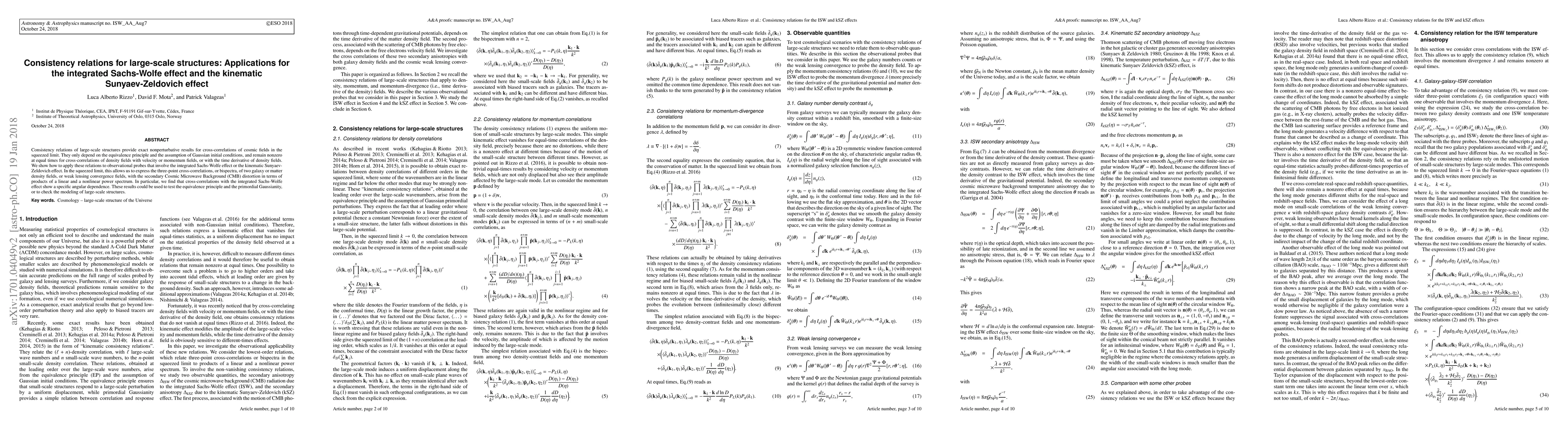 This paper derives consistency relations for large-scale structures that provide exact nonperturbative results for cross-correlations in the squeezed limit, applicable to the integrated Sachs-Wolfe effect and the kinematic Sunyaev-Zeldovich effect. These relations express bispectra of density fields with CMB distortions in terms of linear and nonlinear power spectra, potentially testing the equivalence principle and primordial Gaussianity.