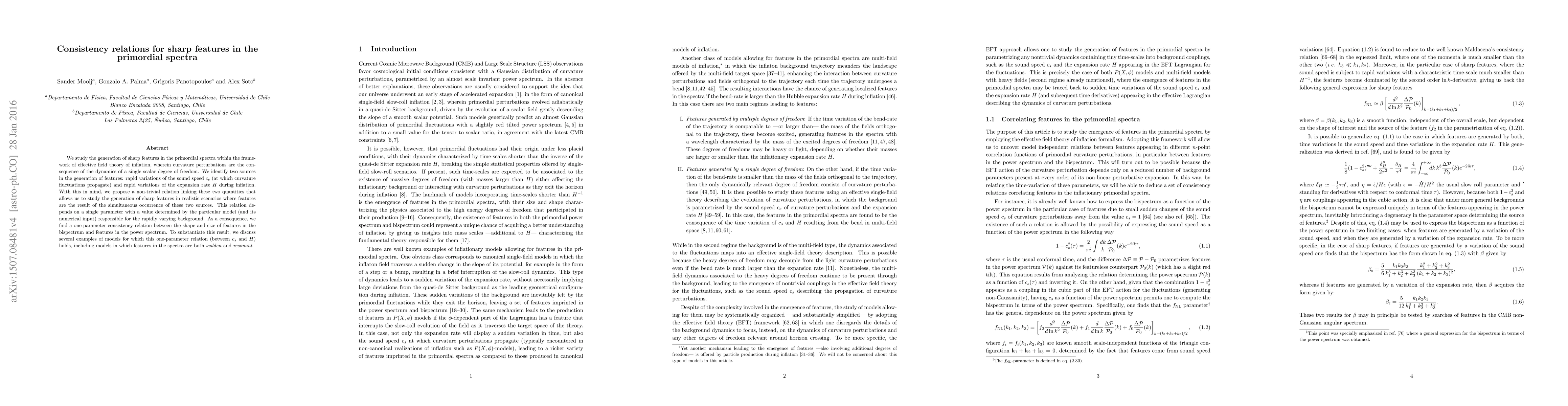 We study the generation of sharp features in the primordial spectra within the framework of effective field theory of inflation, wherein curvature perturbations are the consequence of the dynamics of a single scalar degree of freedom. We identify two sources in the generation of features: rapid variations of the sound speed c_s (at which curvature fluctuations propagate) and rapid variations of the expansion rate H during inflation. With this in mind, we propose a non-trivial relation linking these two quantities that allows us to study the generation of sharp features in realistic scenarios where features are the result of the simultaneous occurrence of these two sources. This relation depends on a single parameter with a value determined by the particular model (and its numerical input) responsible for the rapidly varying background. As a consequence, we find a one-parameter consistency relation between the shape and size of features in the bispectrum and features in the power spectrum. To substantiate this result, we discuss several examples of models for which this one-parameter relation (between c_s and H) holds, including models in which features in the spectra are both sudden and resonant.