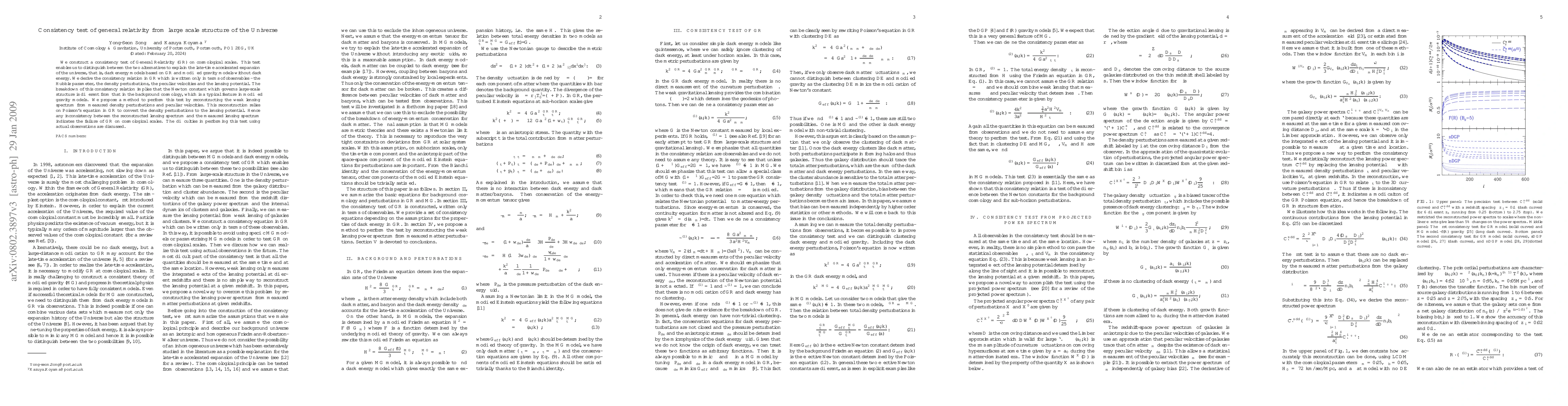This paper proposes a consistency test of General Relativity on cosmological scales to distinguish between dark energy models and modified gravity models. The test relies on reconstructing the weak lensing spectrum from density perturbations and peculiar velocities, and any inconsistency indicates a failure of GR.