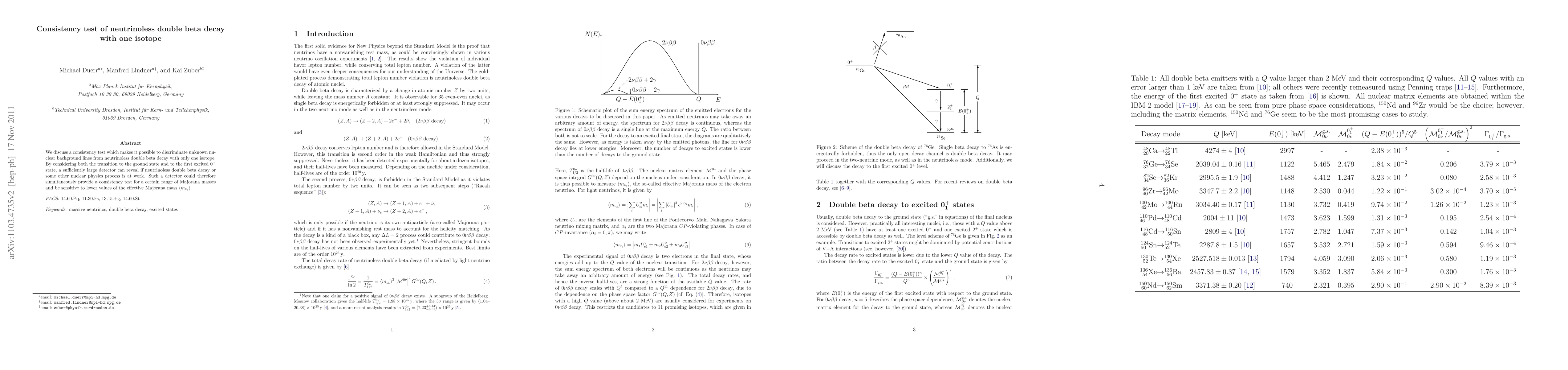This paper proposes a consistency test to distinguish neutrinoless double beta decay from nuclear background using a single isotope, considering both ground and first excited state transitions. A sufficiently large detector can reveal the presence of this decay or other nuclear processes, offering sensitivity to lower effective Majorana masses.
