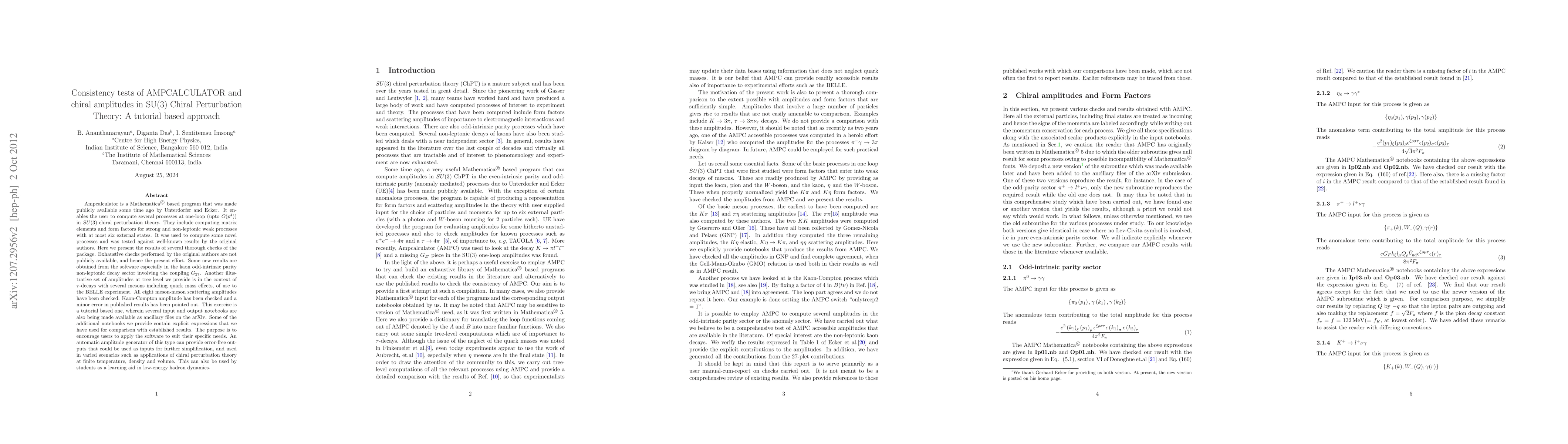 Ampcalculator is a Mathematica based program that was made publicly available some time ago by Unterdorfer and Ecker. It enables the user to compute several processes at one-loop (upto $O(p^4)$) in SU(3) chiral perturbation theory. They include computing matrix elements and form factors for strong and non-leptonic weak processes with at most six external states. It was used to compute some novel processes and was tested against well-known results by the original authors. Here we present the results of several thorough checks of the package. Exhaustive checks performed by the original authors are not publicly available, and hence the present effort. Some new results are obtained from the software especially in the kaon odd-intrinsic parity non-leptonic decay sector involving the coupling $G_{27}$. Another illustrative set of amplitudes at tree level we provide is in the context of $\tau$-decays with several mesons including quark mass effects, of use to the BELLE experiment. All eight meson-meson scattering amplitudes have been checked. Kaon-Compton amplitude has been checked and a minor error in published results has been pointed out. This exercise is a tutorial based one, wherein several input and output notebooks are also being made available as ancillary files on the arXiv. Some of the additional notebooks we provide contain explicit expressions that we have used for comparison with established results. The purpose is to encourage users to apply the software to suit their specific needs. An automatic amplitude generator of this type can provide error-free outputs that could be used as inputs for further simplification, and used in varied scenarios such as applications of chiral perturbation theory at finite temperature, density and volume. This can also be used by students as a learning aid in low-energy hadron dynamics.