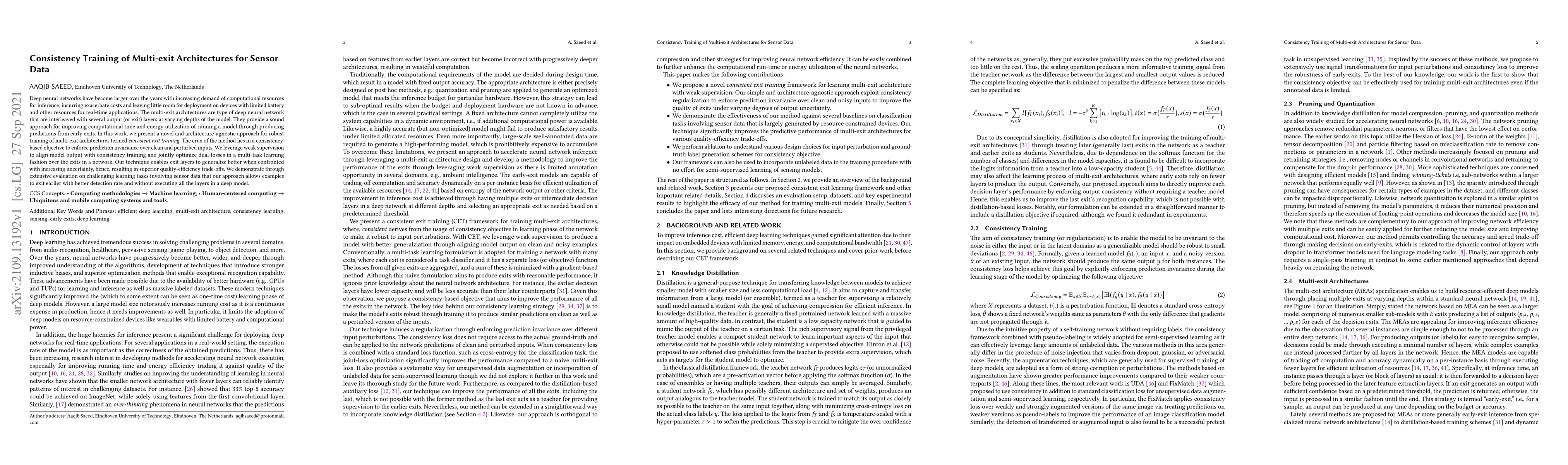 Deep neural networks have become larger over the years with increasing demand of computational resources for inference; incurring exacerbate costs and leaving little room for deployment on devices with limited battery and other resources for real-time applications. The multi-exit architectures are type of deep neural network that are interleaved with several output (or exit) layers at varying depths of the model. They provide a sound approach for improving computational time and energy utilization of running a model through producing predictions from early exits. In this work, we present a novel and architecture-agnostic approach for robust training of multi-exit architectures termed consistent exit training. The crux of the method lies in a consistency-based objective to enforce prediction invariance over clean and perturbed inputs. We leverage weak supervision to align model output with consistency training and jointly optimize dual-losses in a multi-task learning fashion over the exits in a network. Our technique enables exit layers to generalize better when confronted with increasing uncertainty, hence, resulting in superior quality-efficiency trade-offs. We demonstrate through extensive evaluation on challenging learning tasks involving sensor data that our approach allows examples to exit earlier with better detection rate and without executing all the layers in a deep model.