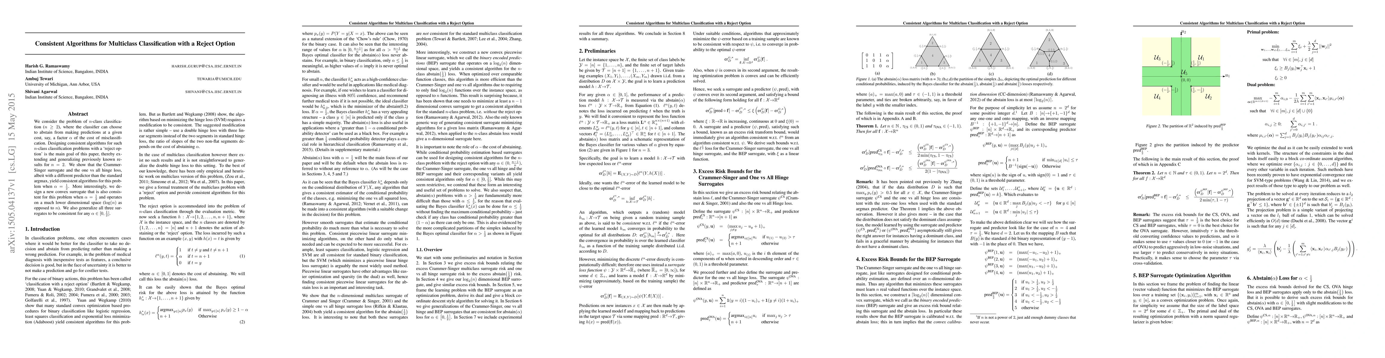 The paper presents consistent algorithms for multiclass classification with a reject option, extending previous results for binary classification. It introduces a new convex surrogate operating in a lower-dimensional space and generalizes existing surrogates to work for any α in [0, 1/2].