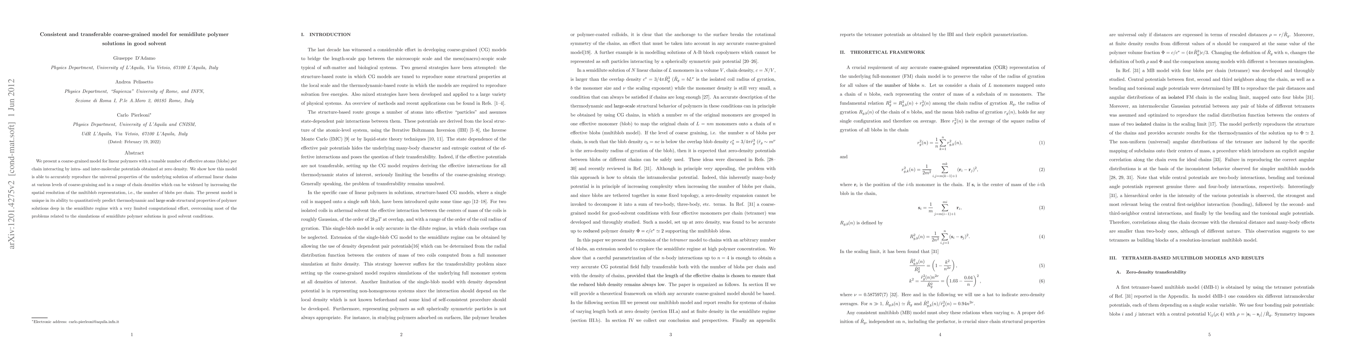 This paper presents a coarse-grained model for semidilute polymer solutions that accurately reproduces the universal properties of athermal linear chains across various densities. The model's tunable blob representation allows for predictions of thermodynamic and structural properties with minimal computational effort.