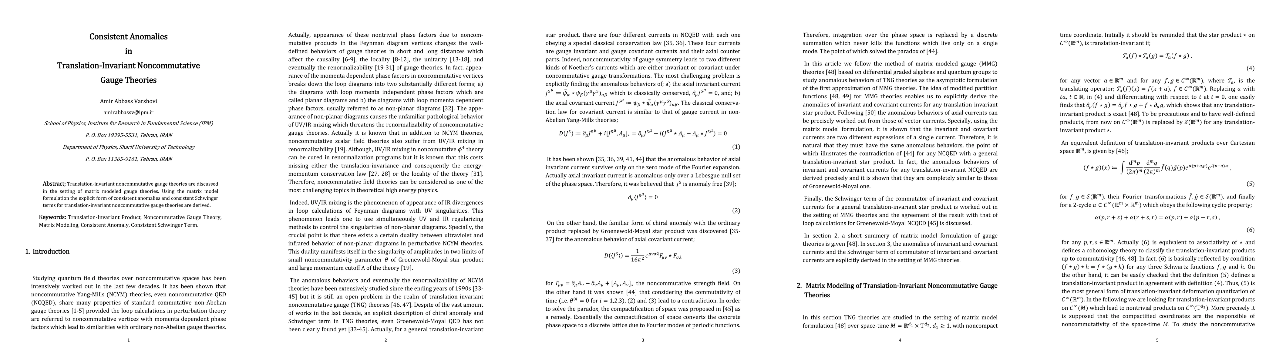 This paper explores translation-invariant noncommutative gauge theories through matrix model formulations, deriving explicit expressions for consistent anomalies and Schwinger terms in this theoretical framework.