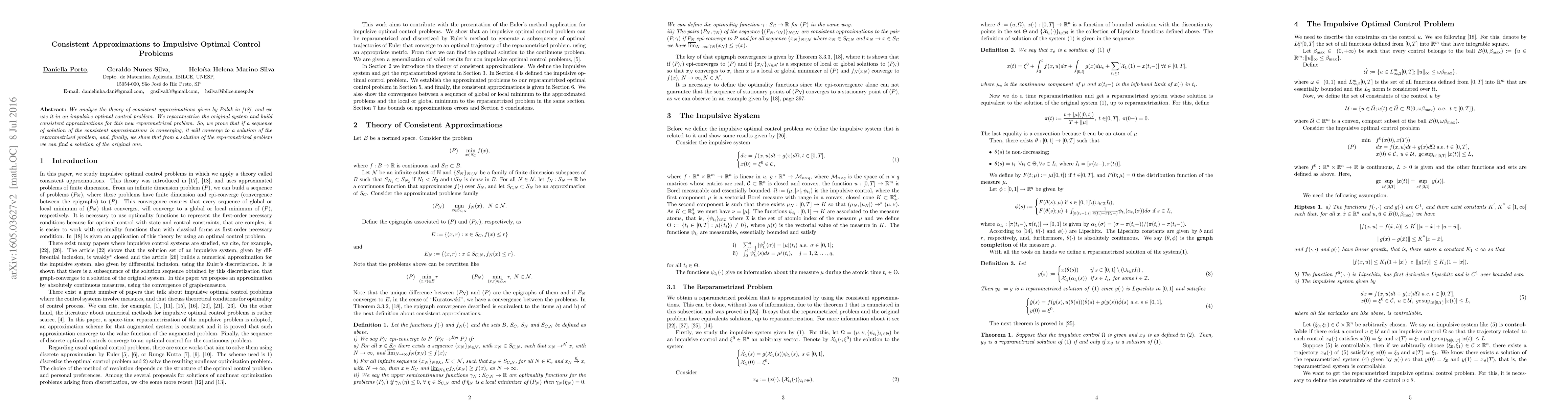 This paper explores the theory of consistent approximations for impulsive optimal control problems, demonstrating that a sequence of solutions from the reparametrized problem converges to a solution of the original problem. The authors show that solutions of the reparametrized problem can be used to find solutions of the original impulsive optimal control problem.