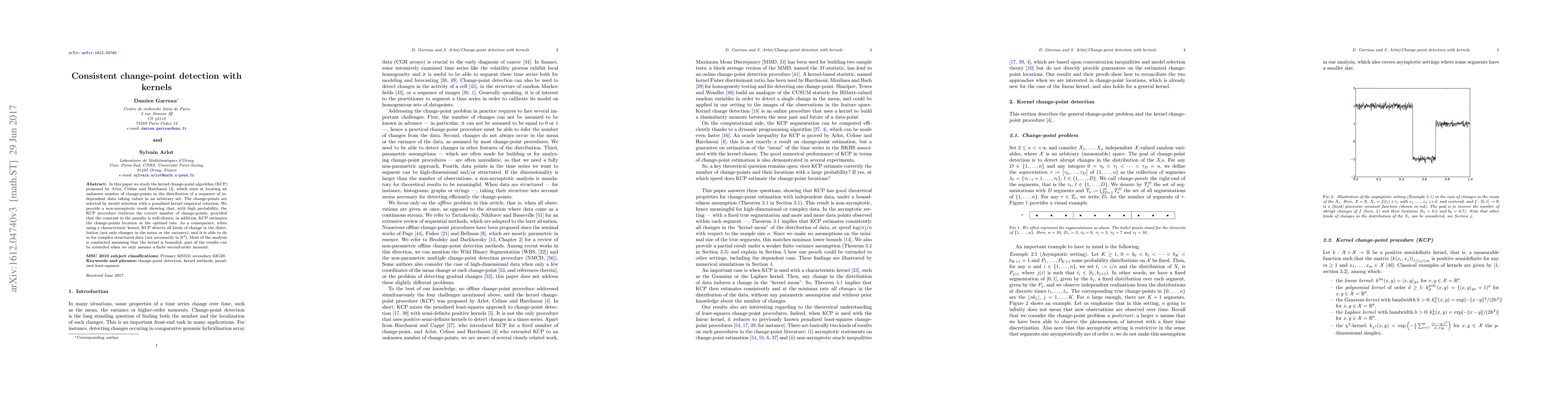 In this paper we study the kernel change-point algorithm (KCP) proposed by Arlot, Celisse and Harchaoui (2012), which aims at locating an unknown number of change-points in the distribution of a sequence of independent data taking values in an arbitrary set. The change-points are selected by model selection with a penalized kernel empirical criterion. We provide a non-asymptotic result showing that, with high probability, the KCP procedure retrieves the correct number of change-points, provided that the constant in the penalty is well-chosen; in addition, KCP estimates the change-points location at the optimal rate. As a consequence, when using a characteristic kernel, KCP detects all kinds of change in the distribution (not only changes in the mean or the variance), and it is able to do so for complex structured data (not necessarily in $\mathbb{R}^d$). Most of the analysis is conducted assuming that the kernel is bounded; part of the results can be extended when we only assume a finite second-order moment.