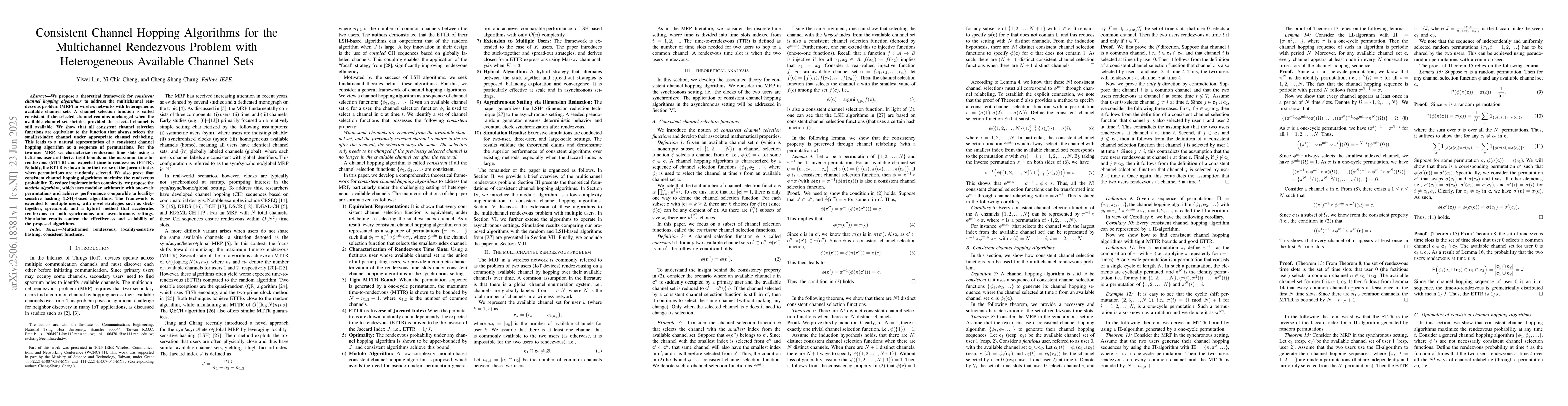 We propose a theoretical framework for consistent channel hopping algorithms to address the multichannel rendezvous problem (MRP) in wireless networks with heterogeneous available channel sets. A channel selection function is called consistent if the selected channel remains unchanged when the available channel set shrinks, provided the selected channel is still available. We show that all consistent channel selection functions are equivalent to the function that always selects the smallest-index channel under appropriate channel relabeling. This leads to a natural representation of a consistent channel hopping algorithm as a sequence of permutations. For the two-user MRP, we characterize rendezvous time slots using a fictitious user and derive tight bounds on the maximum time-to-rendezvous (MTTR) and expected time-to-rendezvous (ETTR). Notably, the ETTR is shown to be the inverse of the Jaccard index when permutations are randomly selected. We also prove that consistent channel hopping algorithms maximize the rendezvous probability. To reduce implementation complexity, we propose the modulo algorithm, which uses modular arithmetic with one-cycle permutations and achieves performance comparable to locality-sensitive hashing (LSH)-based algorithms. The framework is extended to multiple users, with novel strategies such as stick-together, spread-out, and a hybrid method that accelerates rendezvous in both synchronous and asynchronous settings. Simulation results confirm the effectiveness and scalability of the proposed algorithms.