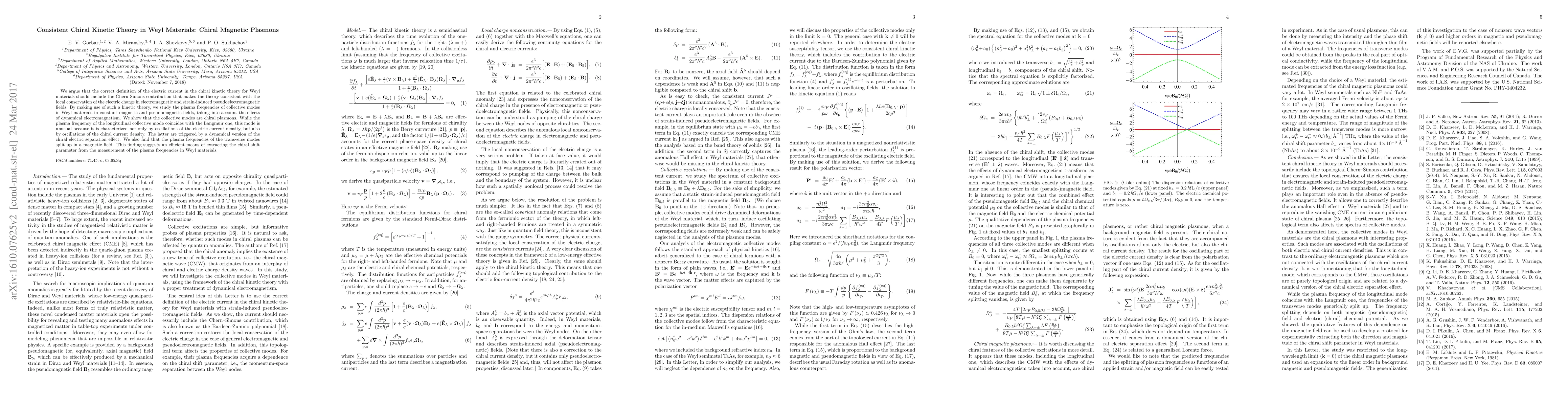This paper proposes a refined chiral kinetic theory for Weyl materials that includes the Chern-Simons contribution for electric current consistency. It reveals that collective modes in these materials are chiral plasmons, with unique oscillations in chiral current density and split plasma frequencies in magnetic fields, offering a method to measure chiral shift parameters.