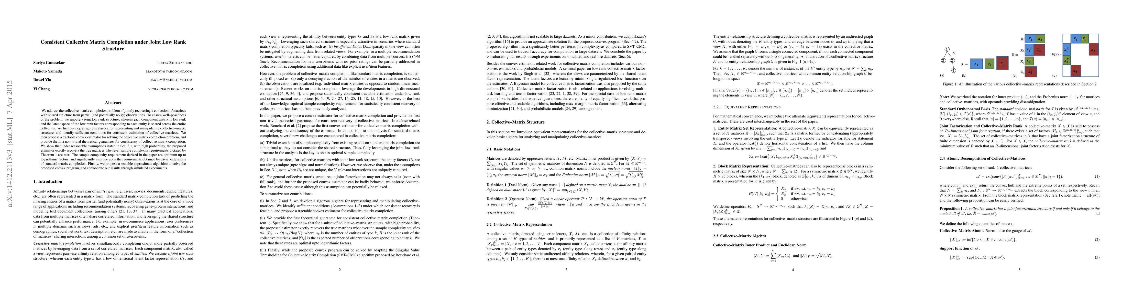This paper tackles the collective matrix completion problem by jointly recovering a collection of matrices with shared low rank structure from partial observations. It proposes a convex estimator with theoretical guarantees for consistency and optimal sample complexity, along with a scalable approximate algorithm, validated through simulations.